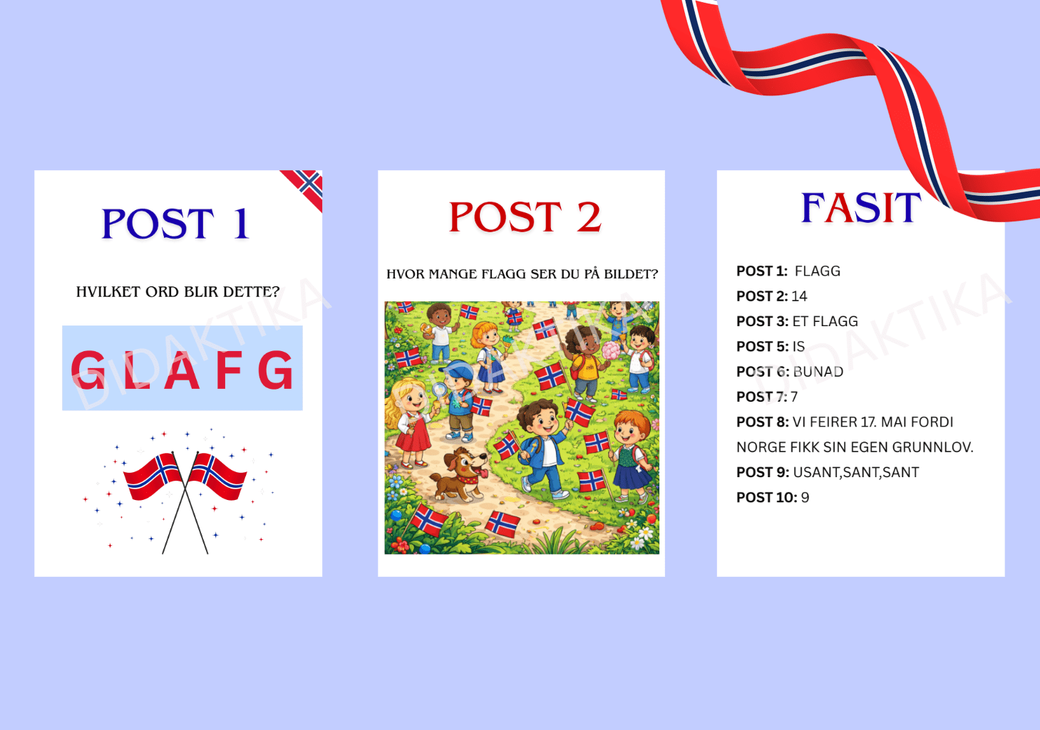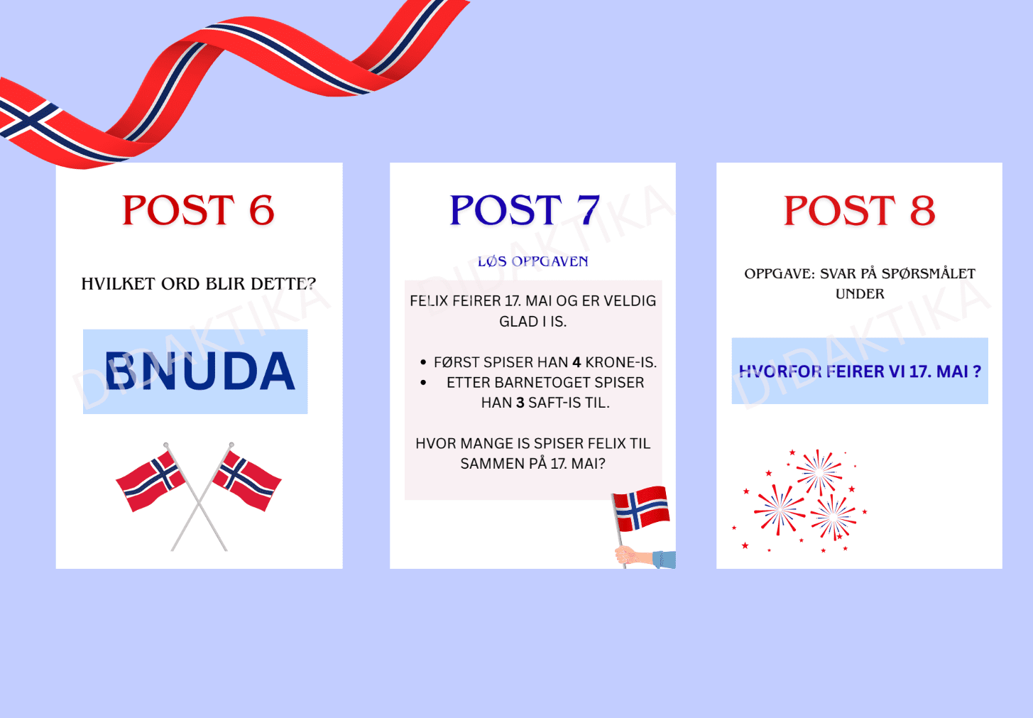 Opplegget krever lite forberedelse. Print ut postene, heng dem opp ute eller inne, og la elevene jobbe i grupper. Perfekt for en aktiv og lærerik økt i forkant av 17. mai 🇳🇴✨
