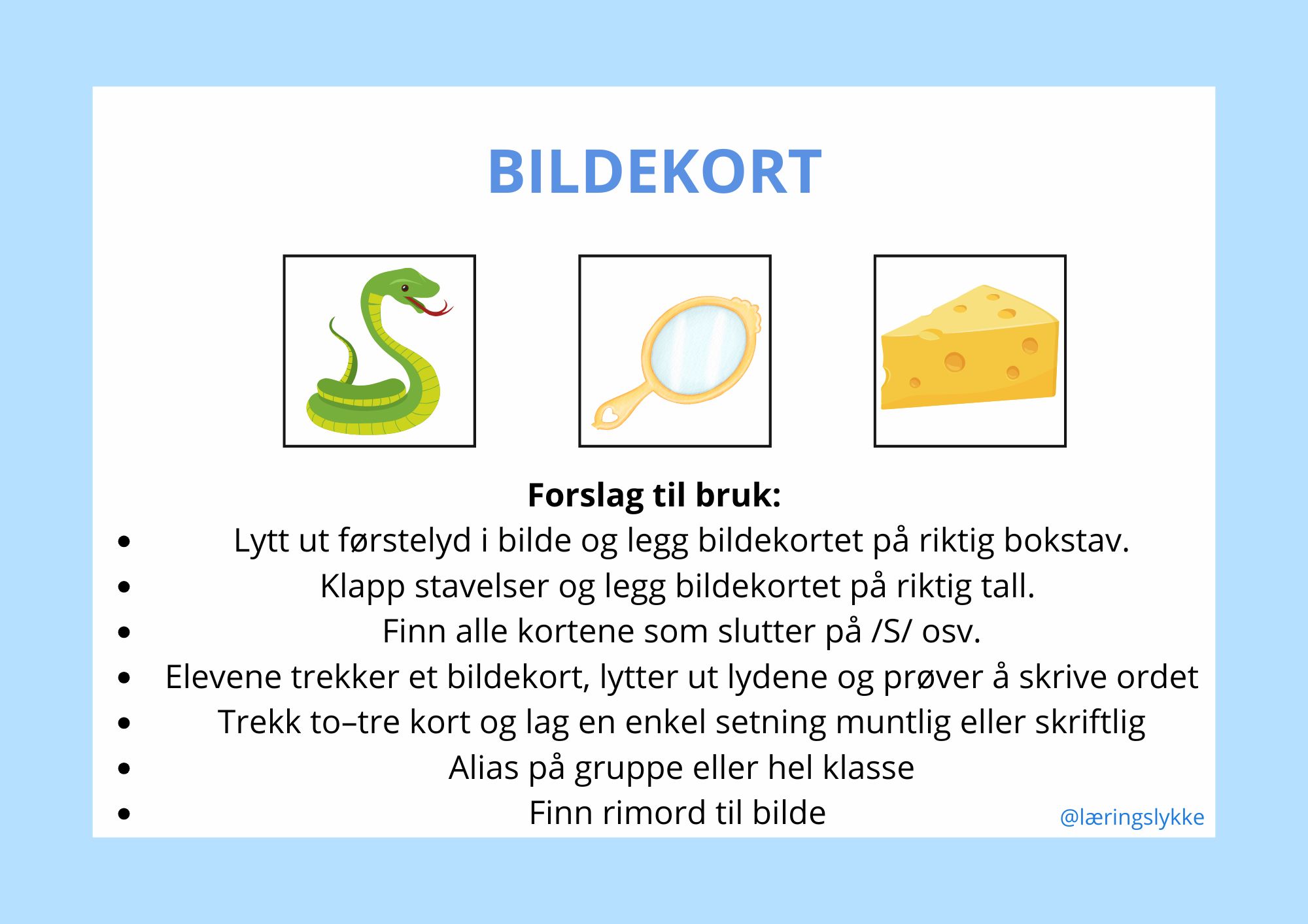 200 bildekort som gjør språkleken morsom og variert! Perfekt til førstelyd, rim, stavelser, ordlæring og setningsbygging – et allsidig verktøy for begynneropplæringen.