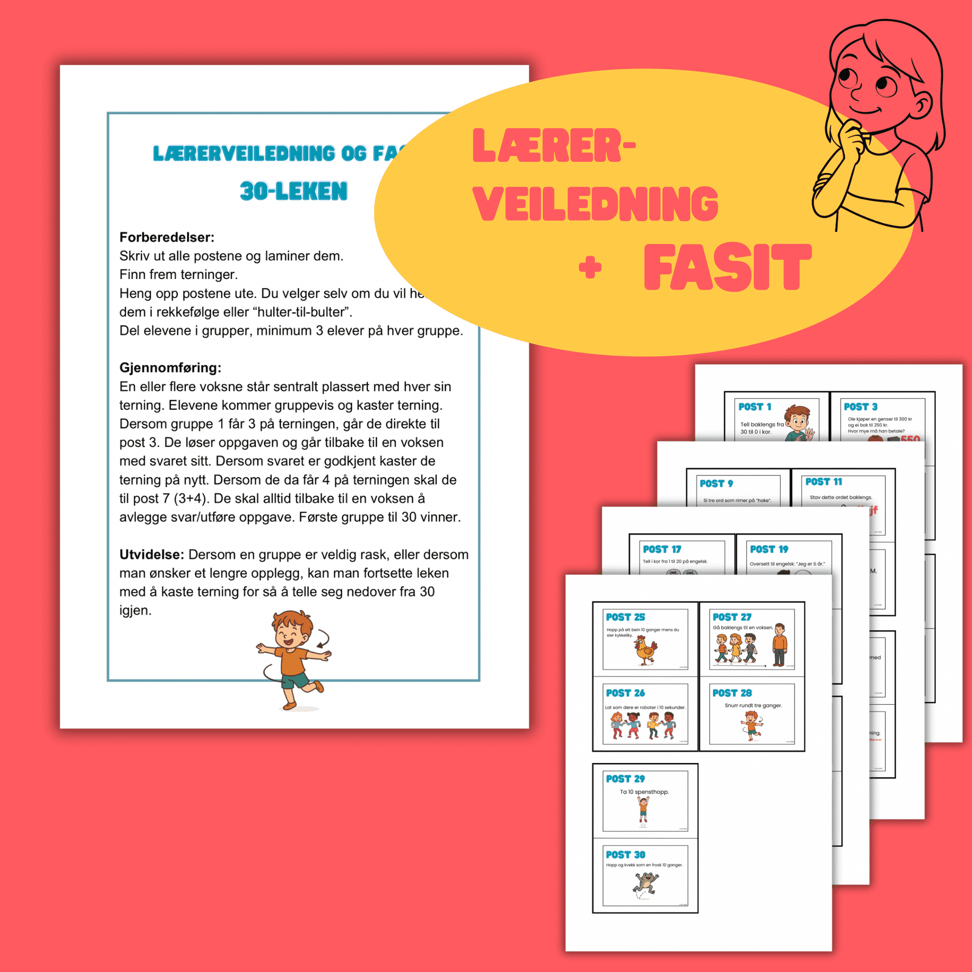 30-leken kommer med 30 ulike poster med oppgaver fra fag som matte, norsk og engelsk ++. Lærerveiledning og fasit følger med. Dette er et perfekt opplegg for uteskole, både med faglig innhold og mulighet for fysisk aktivitet idet gruppene tar seg fra post til post. Lykke til!
