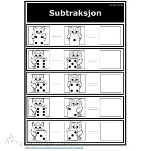 •Det er 3 arbeidsark Subtraksjon med 5 regnestykker på hvert ark.