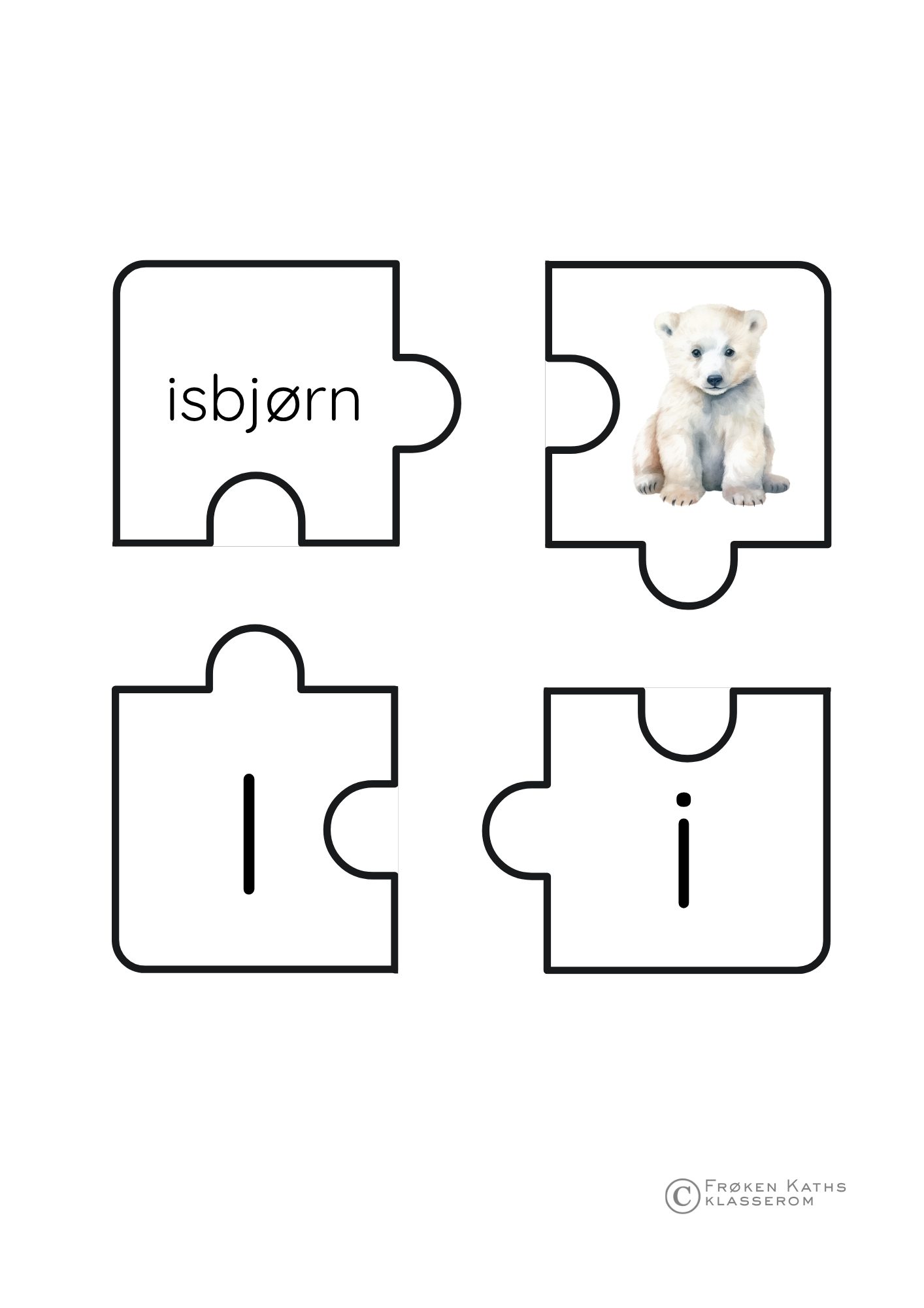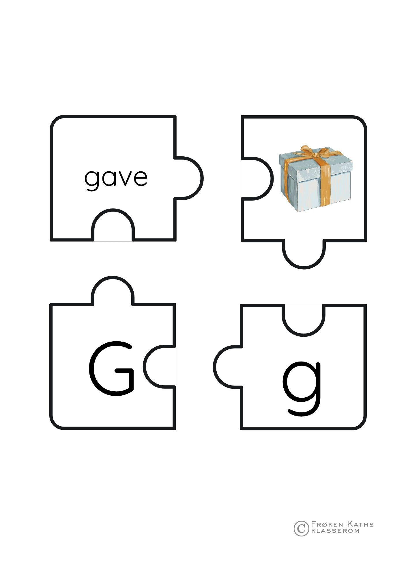 Spre puslespillbrikkene utover bordet. Barnas oppgave er Ã¥ være “bokstav-detektiver” og finne de fire delene som hører sammen for hver bokstav. For Ã¥ gjøre materialet slitesterkt og klart for mange runder med lek, anbefales det Ã¥ laminere arkene før brikkene klippes ut.