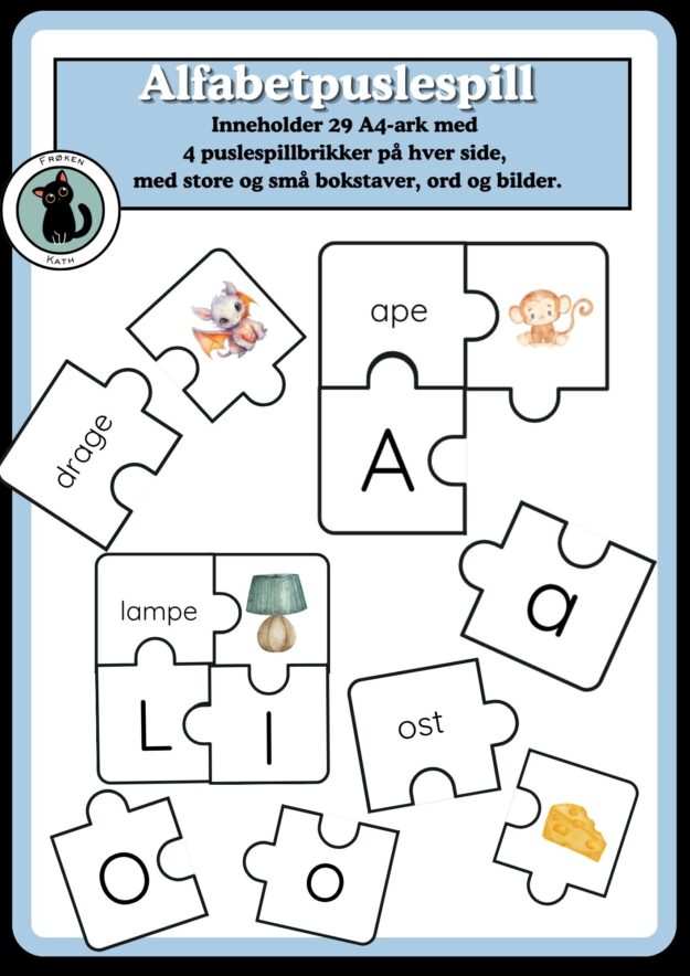 Dette fargerike og lærerike bokstavpuslespillet er en fin ekstraressurs for barn som skal lære seg alfabetet og å lese. Gjennom å koble sammen bokstaver, ord og bilder får barna en dypere forståelse for sammenhengen mellom bokstavlyd og symbol.