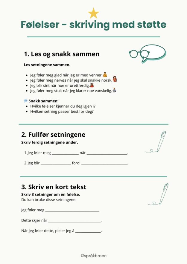 Arbeidsark for setningsbygging til temaet følelser, laget for minoritetsspråklige elever i velkomstklasse og andrespråksundervisning.