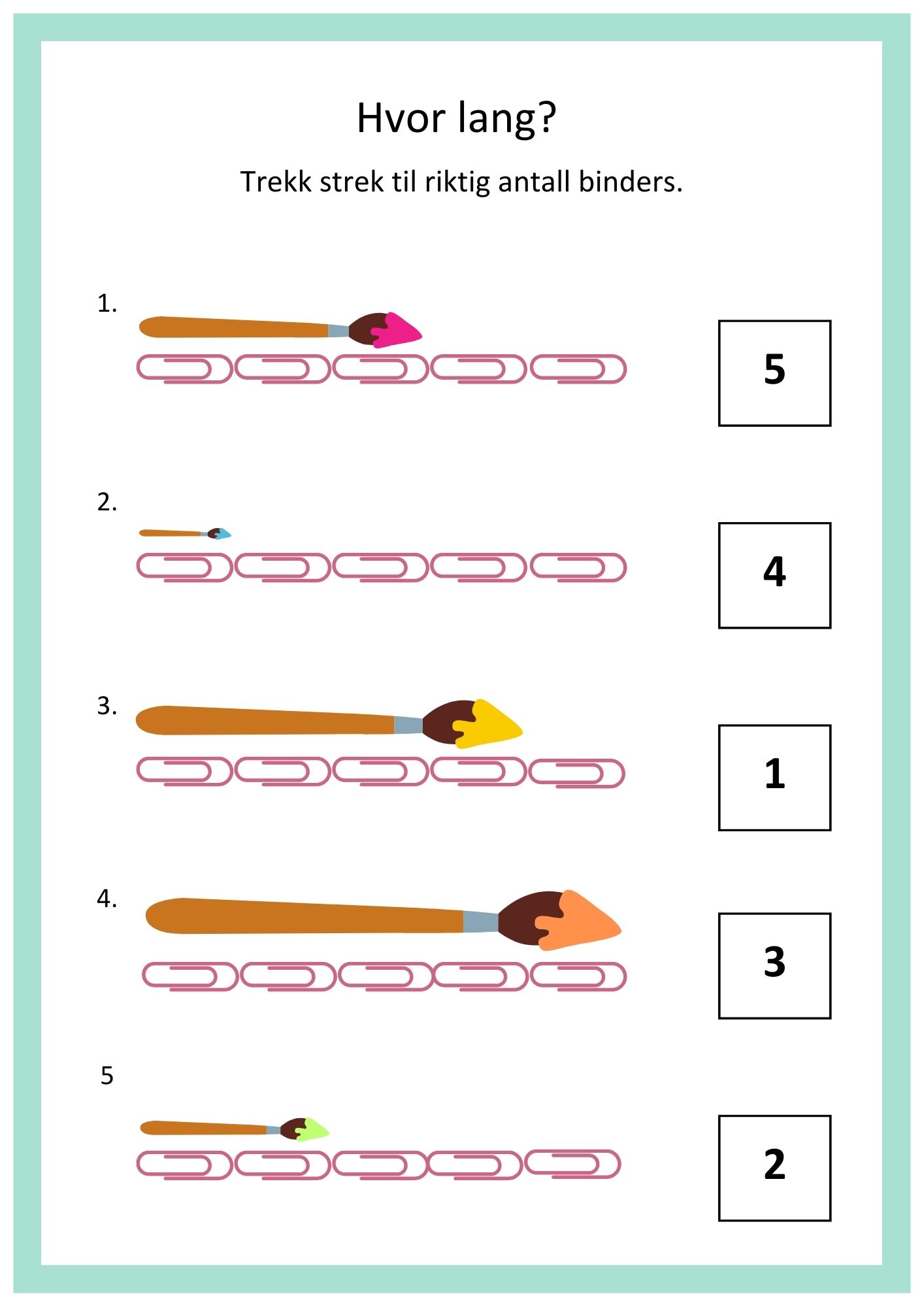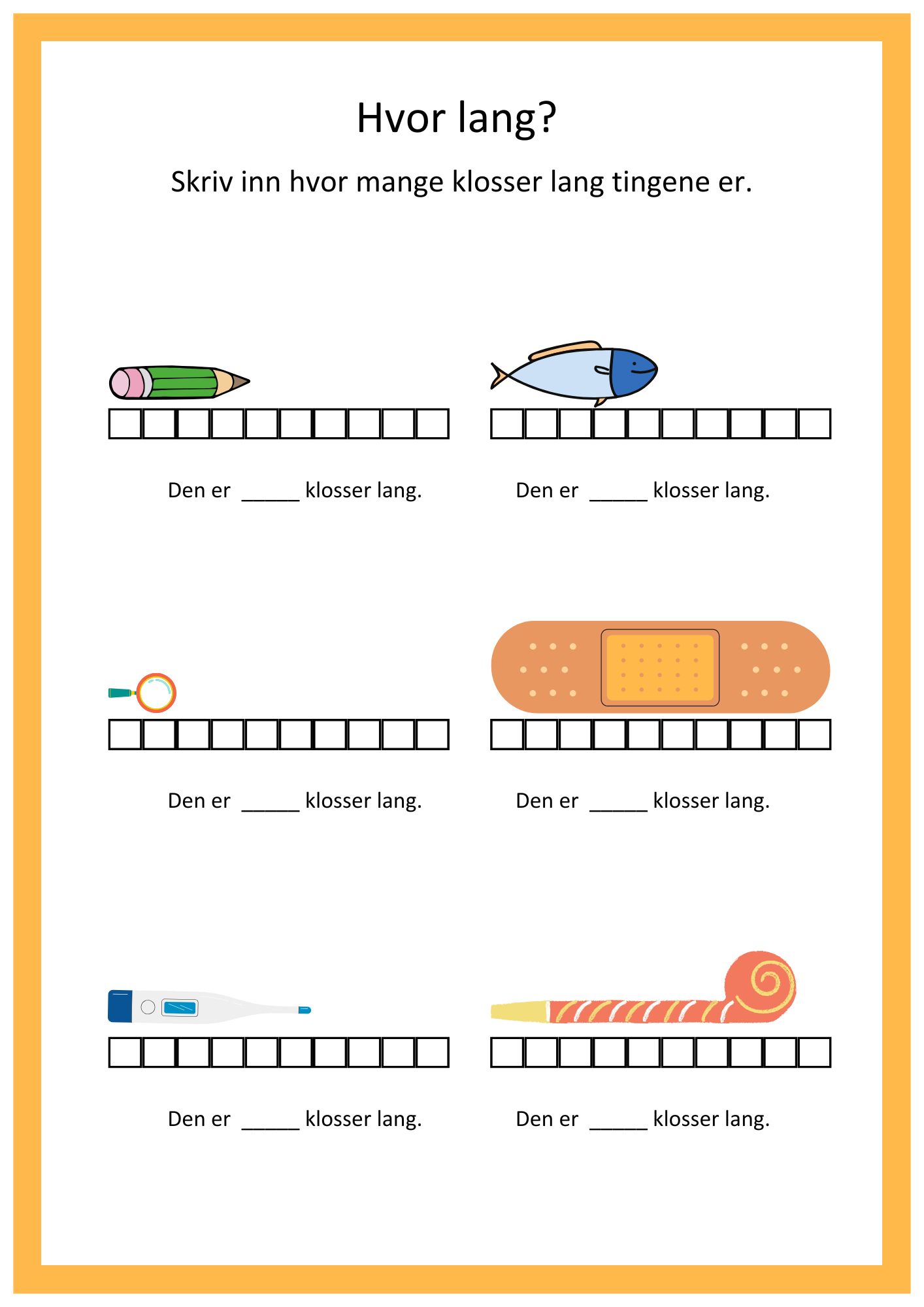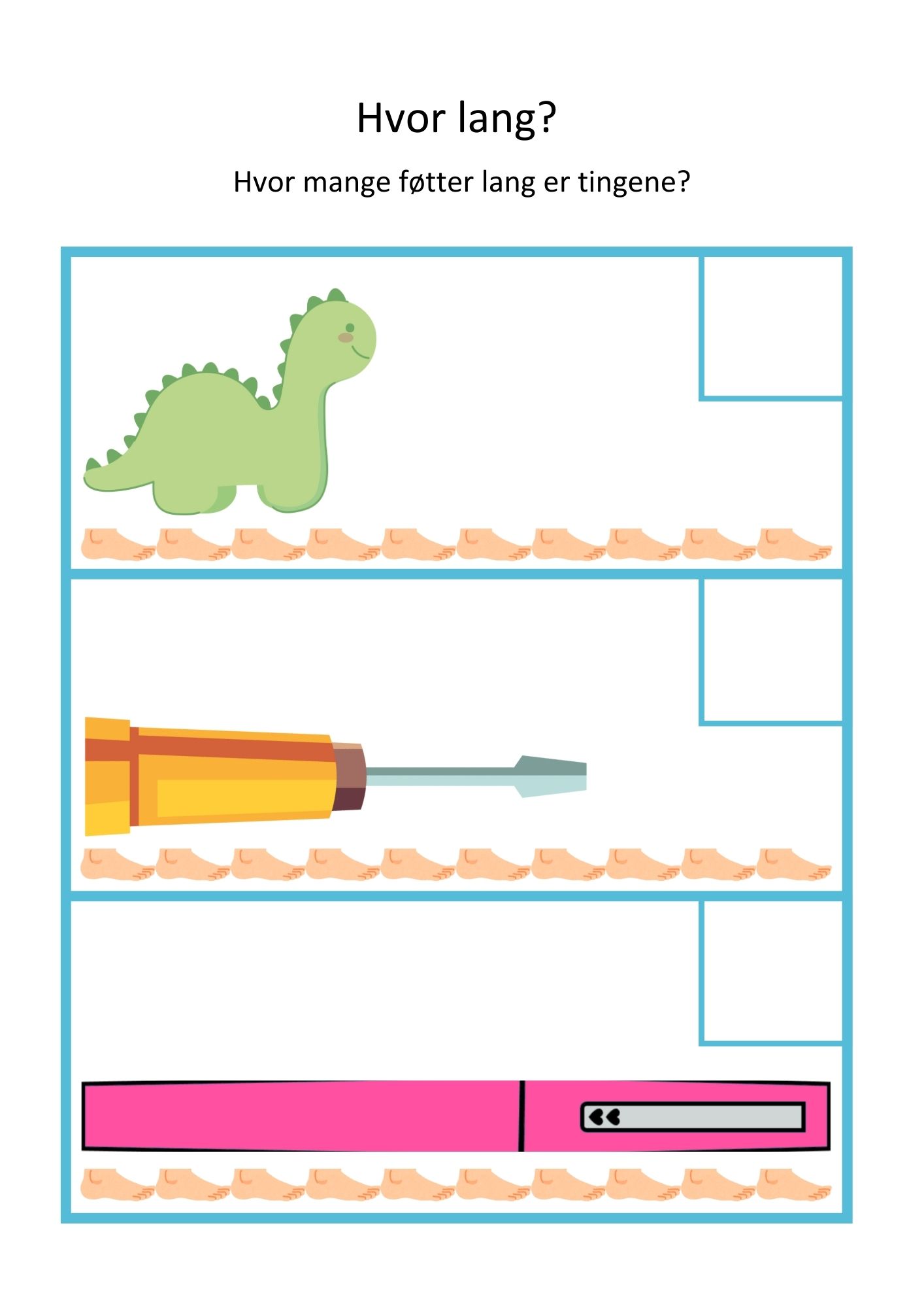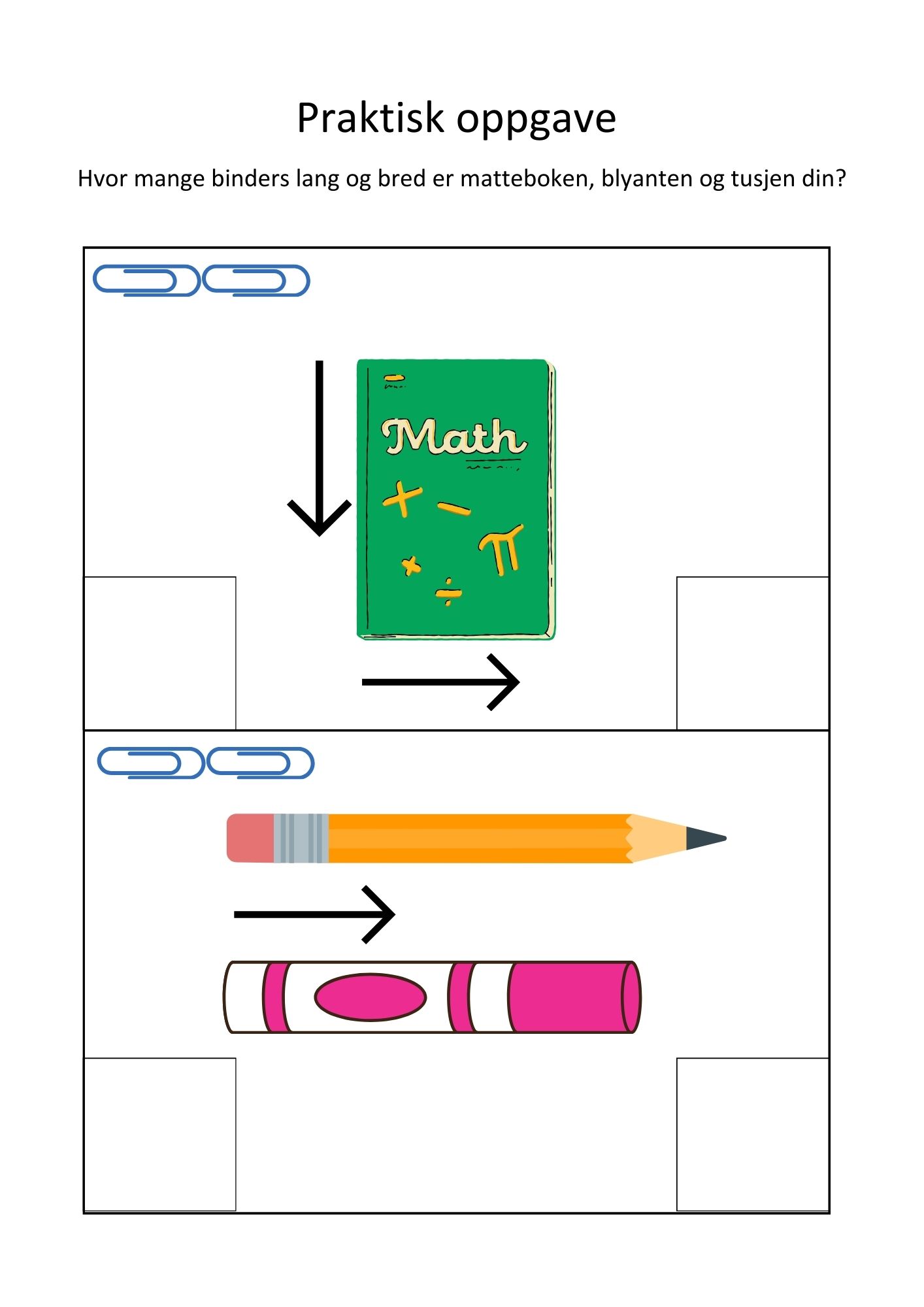 Undervisningsmateriell: I dette undervisningsmaterialet får du et arbeidshefte for å lære elevene om ikke-standardiserte målenheter. Elevene arbeider først med teoretiske oppgaver på arkene, og lærer seg måling gjennom antall klosser, binders, føtter, hender, og blyanter. Begrepene lengde, bredde og høyde brukes i arbeidsoppgavene. Deretter så skal eleven måle med de samme ikke-standardiserte enhetene i praktiske oppgaver. I de praktiske oppgavene så skal man f.eks. måle klasserommet, ryggsekken, pulten, stolen, hyller, tavle, bøker med mere. Til sist så skal eleven tegne noe ut i fra forståelsen av lengere og kortere.