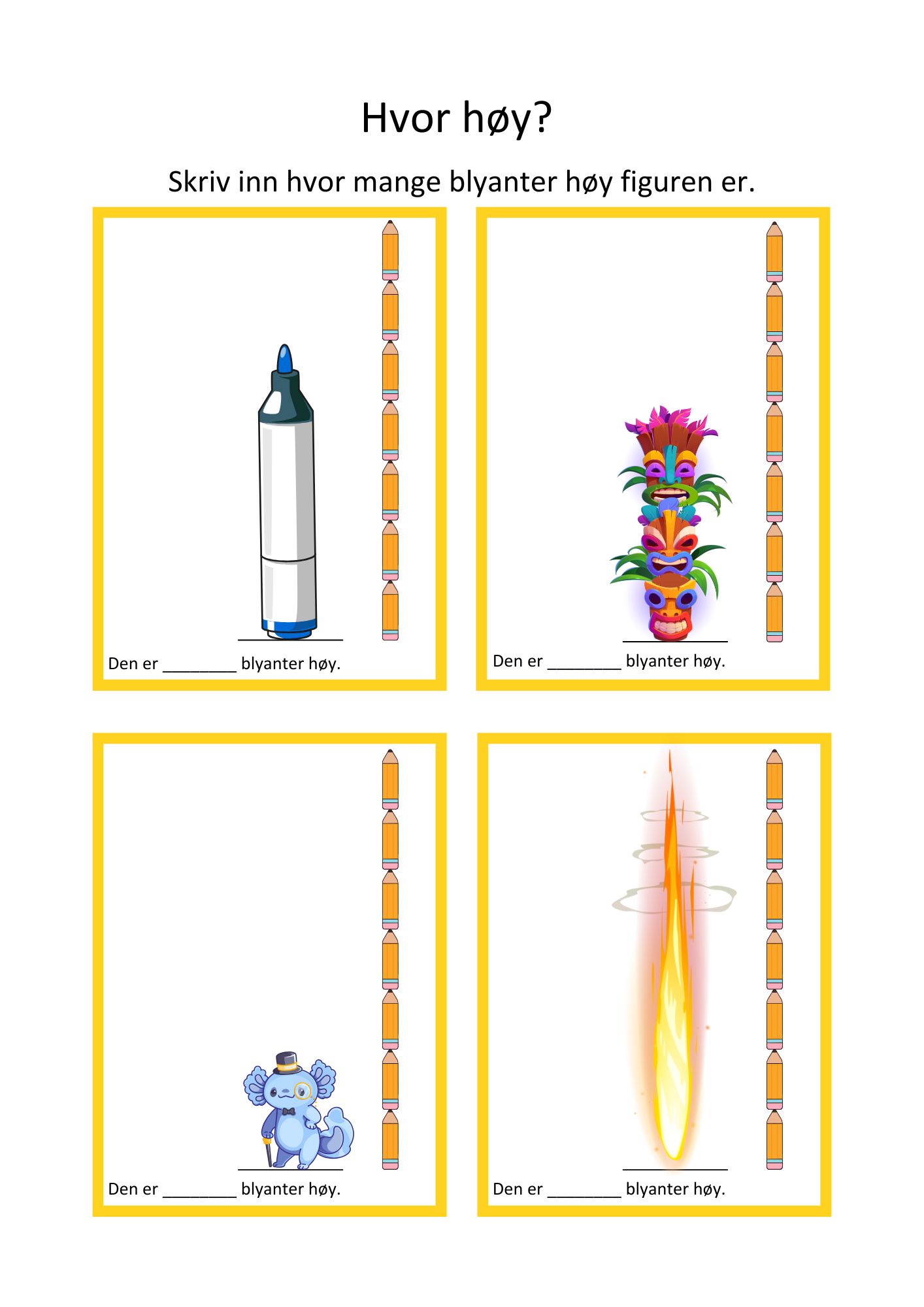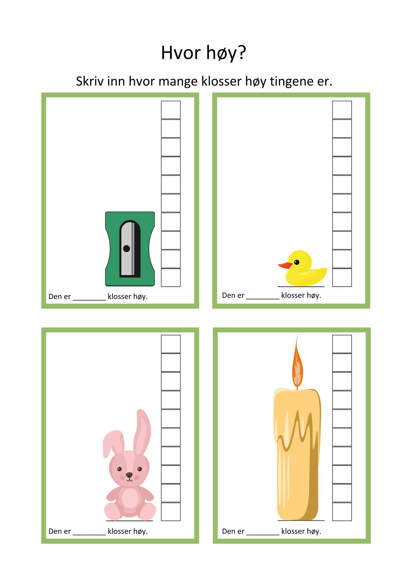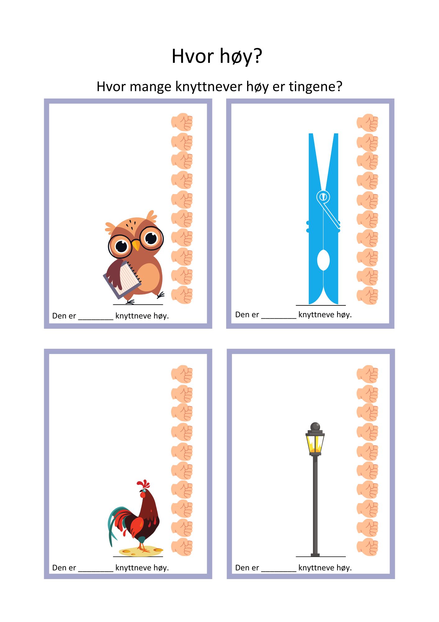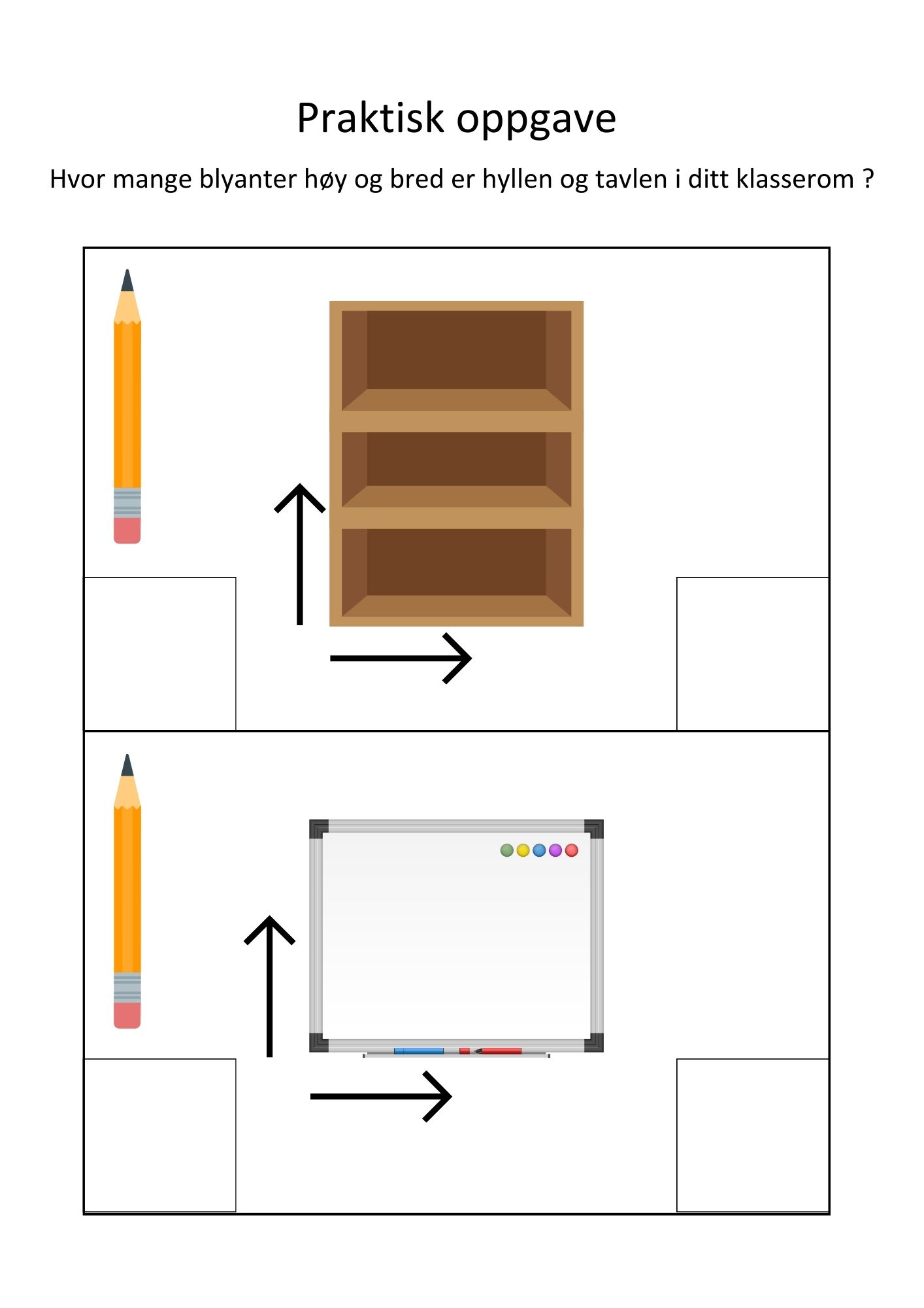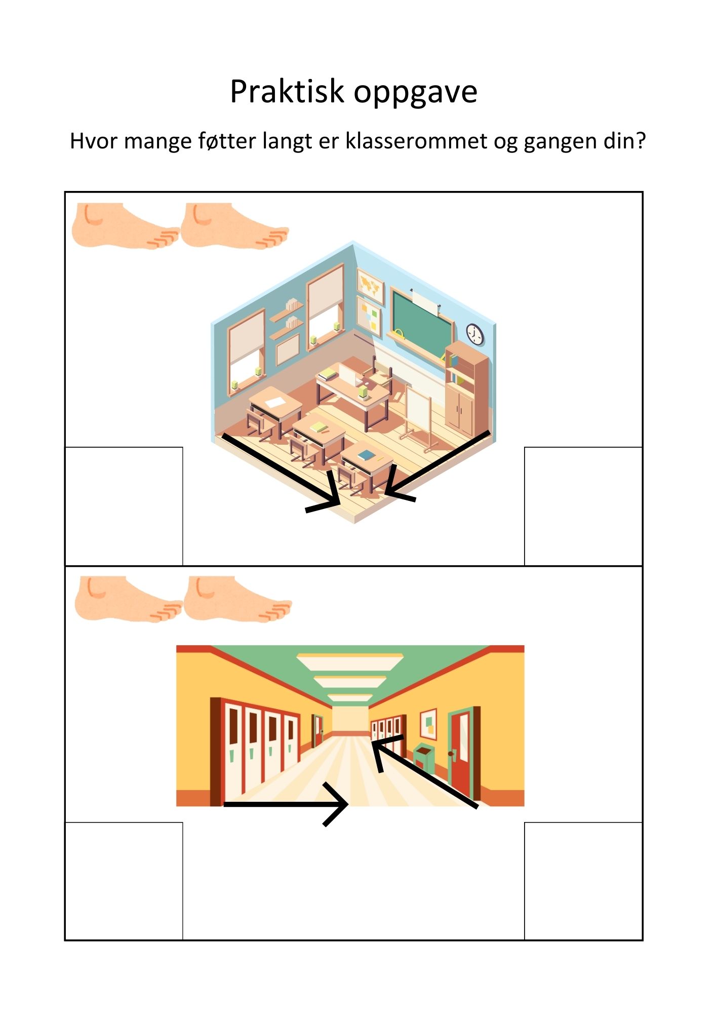 Undervisningsmateriell: I dette undervisningsmaterialet får du et arbeidshefte for å lære elevene om ikke-standardiserte målenheter. Elevene arbeider først med teoretiske oppgaver på arkene, og lærer seg måling gjennom antall klosser, binders, føtter, hender, og blyanter. Begrepene lengde, bredde og høyde brukes i arbeidsoppgavene. Deretter så skal eleven måle med de samme ikke-standardiserte enhetene i praktiske oppgaver. I de praktiske oppgavene så skal man f.eks. måle klasserommet, ryggsekken, pulten, stolen, hyller, tavle, bøker med mere. Til sist så skal eleven tegne noe ut i fra forståelsen av lengere og kortere.