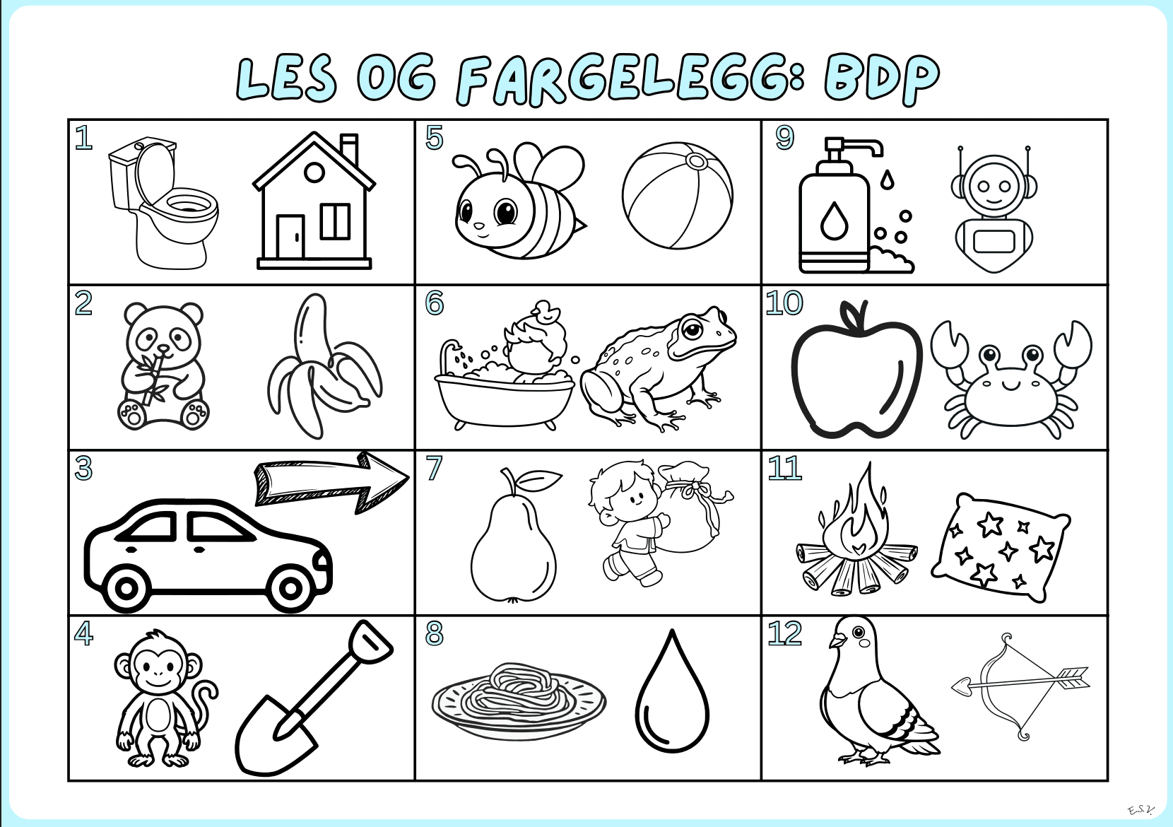 BDP Les og fargelegg (1 ark med bilder, 2 ulike ark med ord)