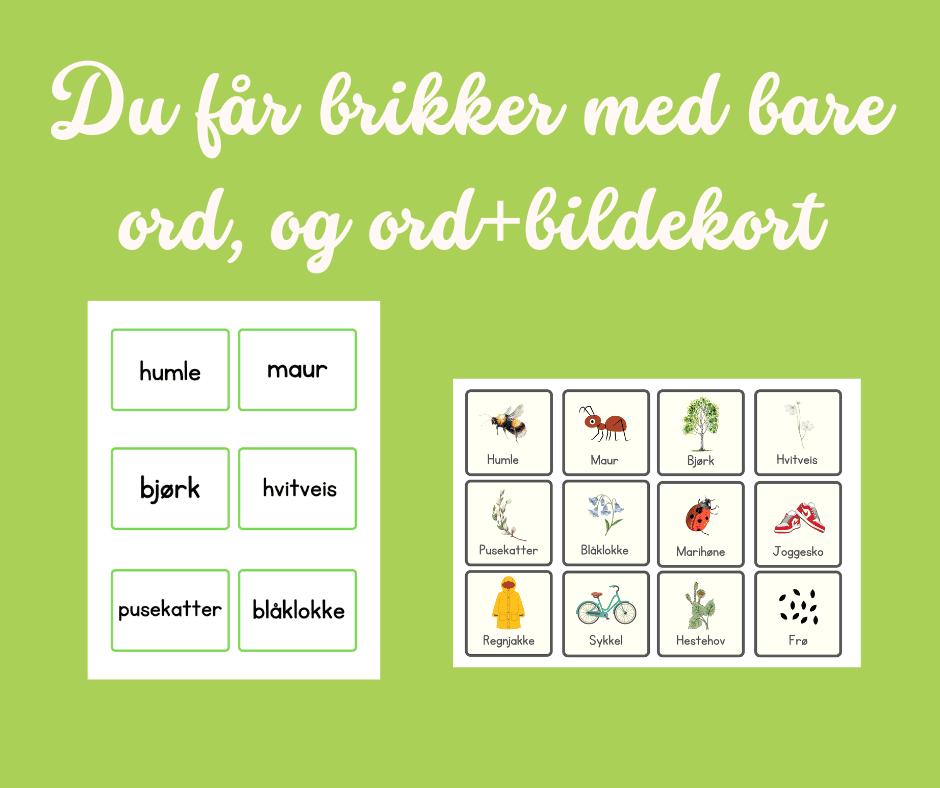 Du får et spillbrett med ulike bilder, og to typer spillkort. Du får både rene ordkort, og kort med ordene og bildet. Dette gjør det enklere å tilrettelegge for ulike nivå og aldersgrupper.
