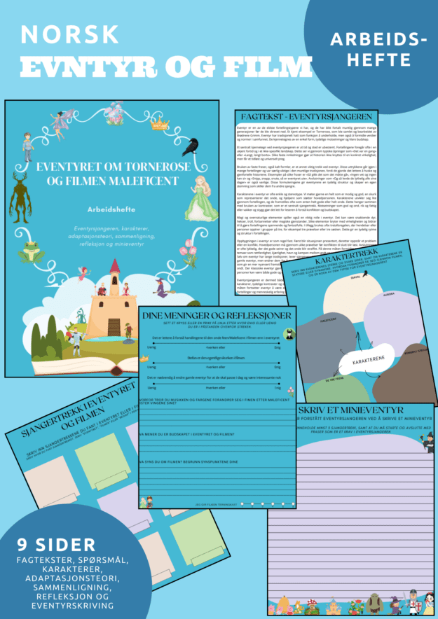 Dette er et arbeidshefte som tar utgangspunkt i eventyrsjangeren og adaptasjonen fra eventyret Tornerose til Disney’s Maleficent. Kan brukes i norskfaget og i ungdomsskolens tilvalgsfag norsk fordypning.