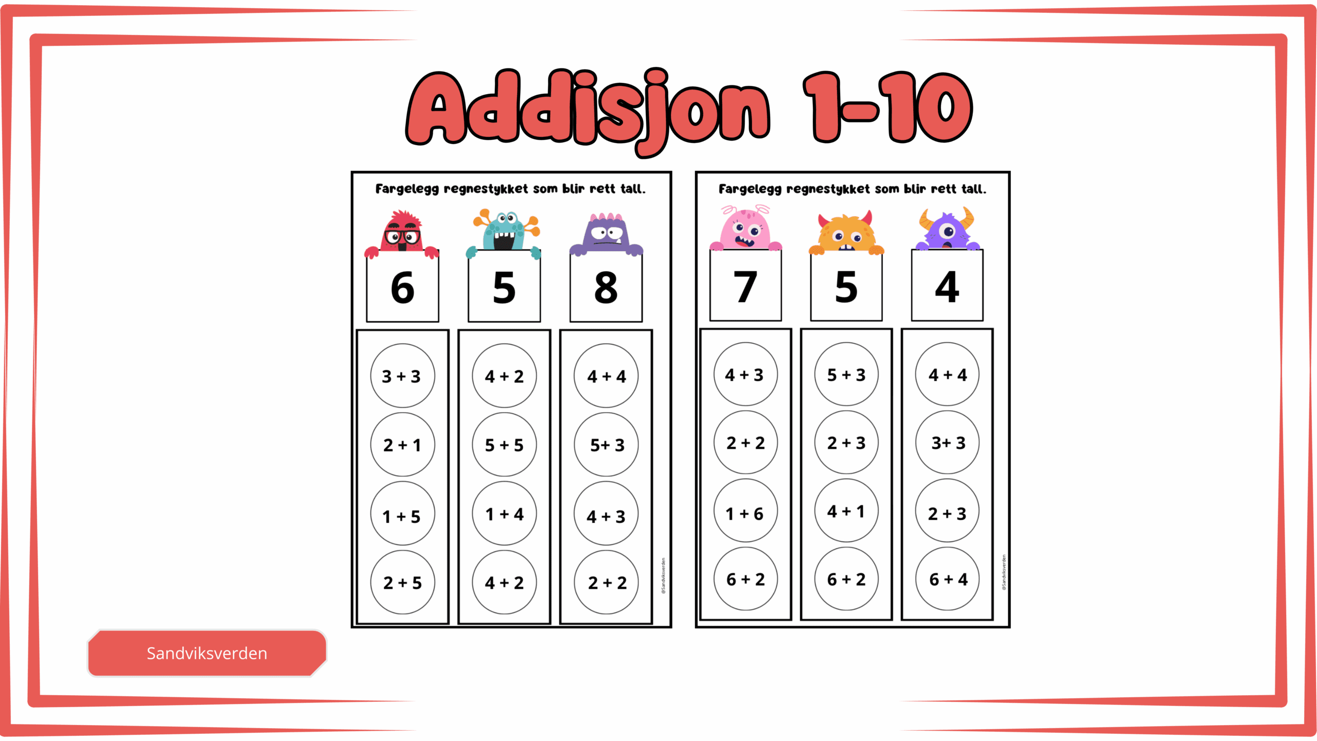 Elevene skal regne ut regnestykkene og fargelegge den sirkelen hvor regnestykket blir det samme som tallet som monsteret holder. Det er totalt fem arbeidsark.