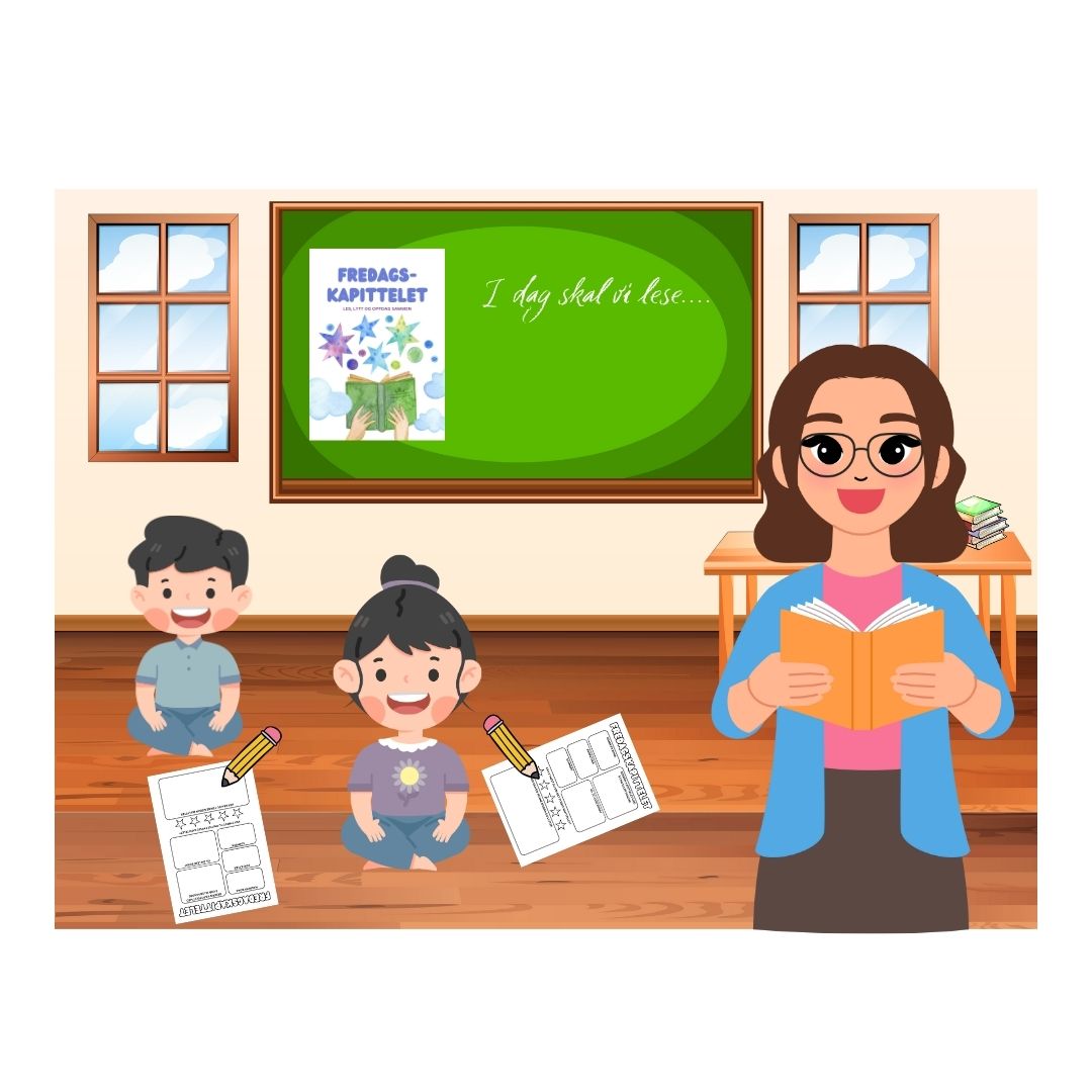 Dette er et enkelt og engasjerende høytlesningsopplegg der klassen hver fredag får høre første kapittel fra en ny bok. Etter eller under høytlesningen får elevene evaluere teksten med et tilpasset evalueringsark som inviterer til refleksjon og diskusjon stemning, karakterer og videre leselyst. Før man starter høytlesningen må læreren presentere boken, forfatteren og sjangeren som boken går under. De andre delene av evalueringsarket, fyller elevene ut selv. Det andre bildet er for å illustrere hvordan opplegget kan bli gjennomført. Elevene kan sitte/ligge komfortabelt på gulvet eller i en lesekrok mens læreren leser. Dette gir en fin stund sammen og et avbrekk fra å sitte ved pulten.