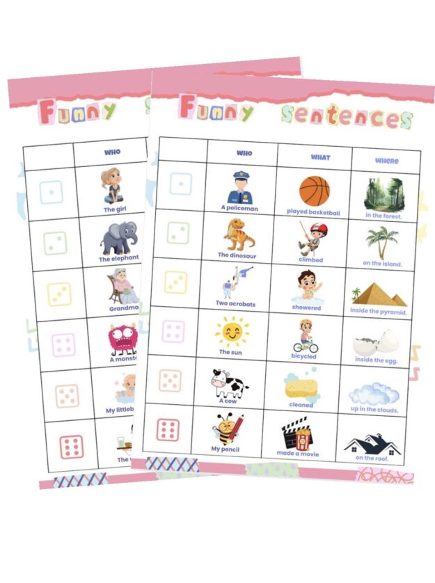 Arbeidsark som hjelper elevene med å øve på å skrive enkle engelske setninger. Elevene bruker en terning for å trille setningene. Først triller de terningen for å finne ut hvem (who), deretter triller de på nytt for å finne ut hva personen gjør (what), og til slutt en tredje gang for å finne ut hvor handlingen skjer (where).