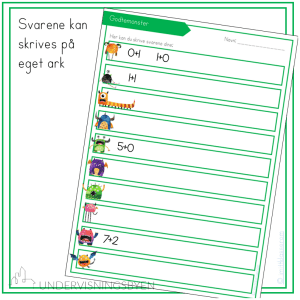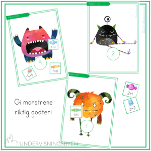 Forslag til klasseaktivitet: Spre monstrene utover i klasserommet, og legg godtekortene i en skål eller boks et sted i klasserommet. Elevene kan så hente seg en godterioppgave og legge på riktig monster, før de tar en ny oppgave og gjentar. De fortsetter til alt godteriet er delt ut. Om det passer, kan elevene deretter gå rundt med svararket og skrive ned de ulike svarene som ligger på hvert enkelt monster.
