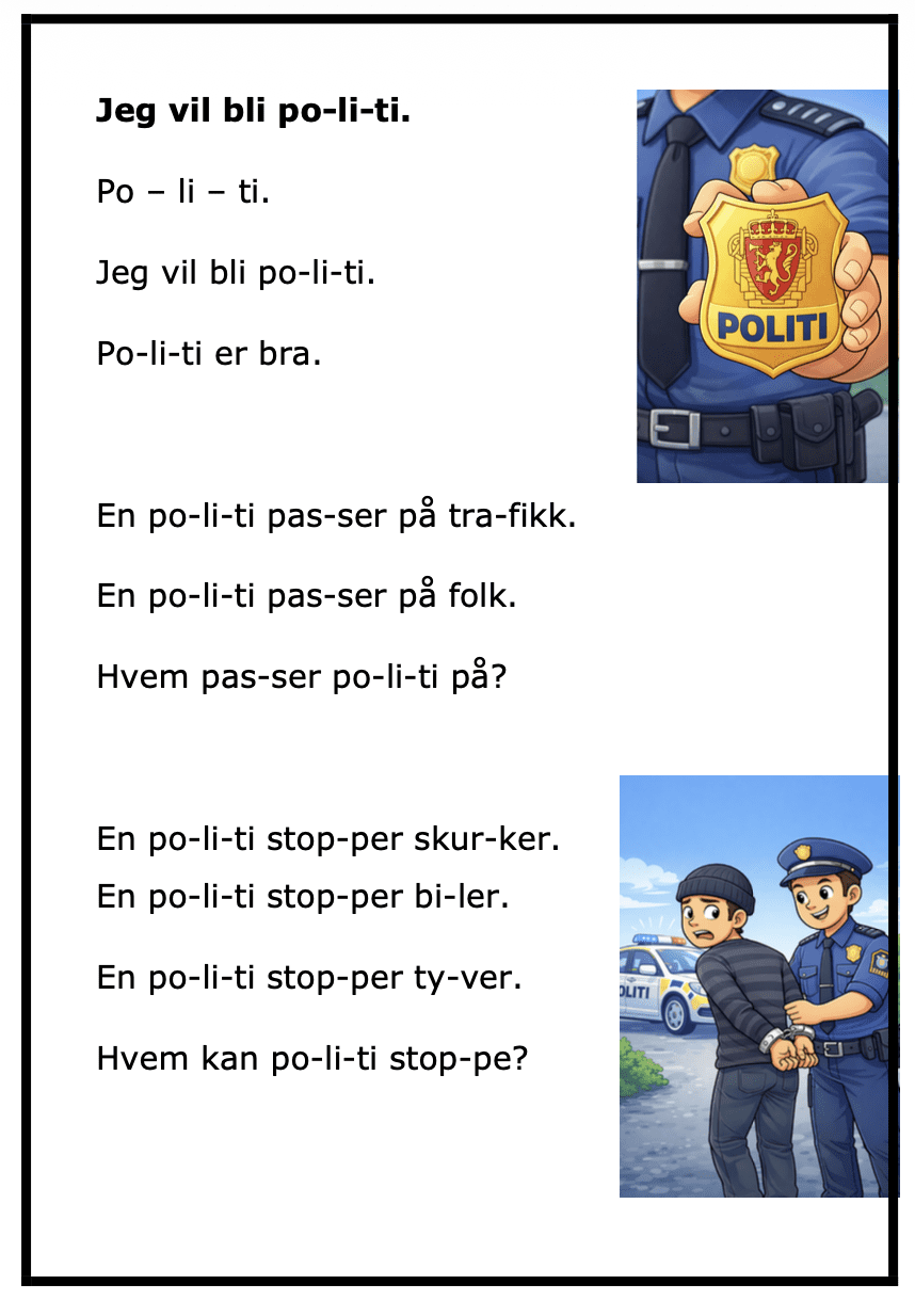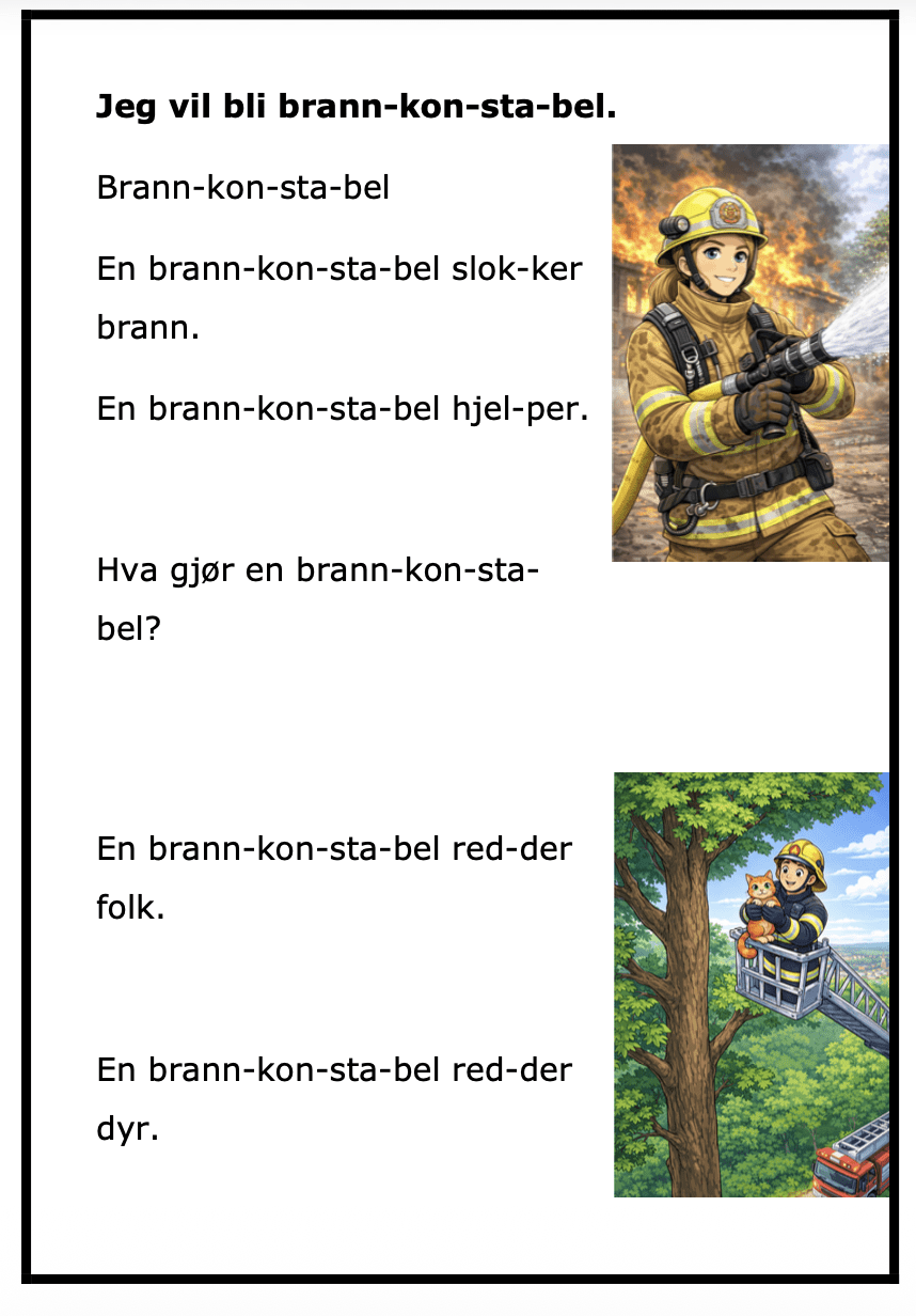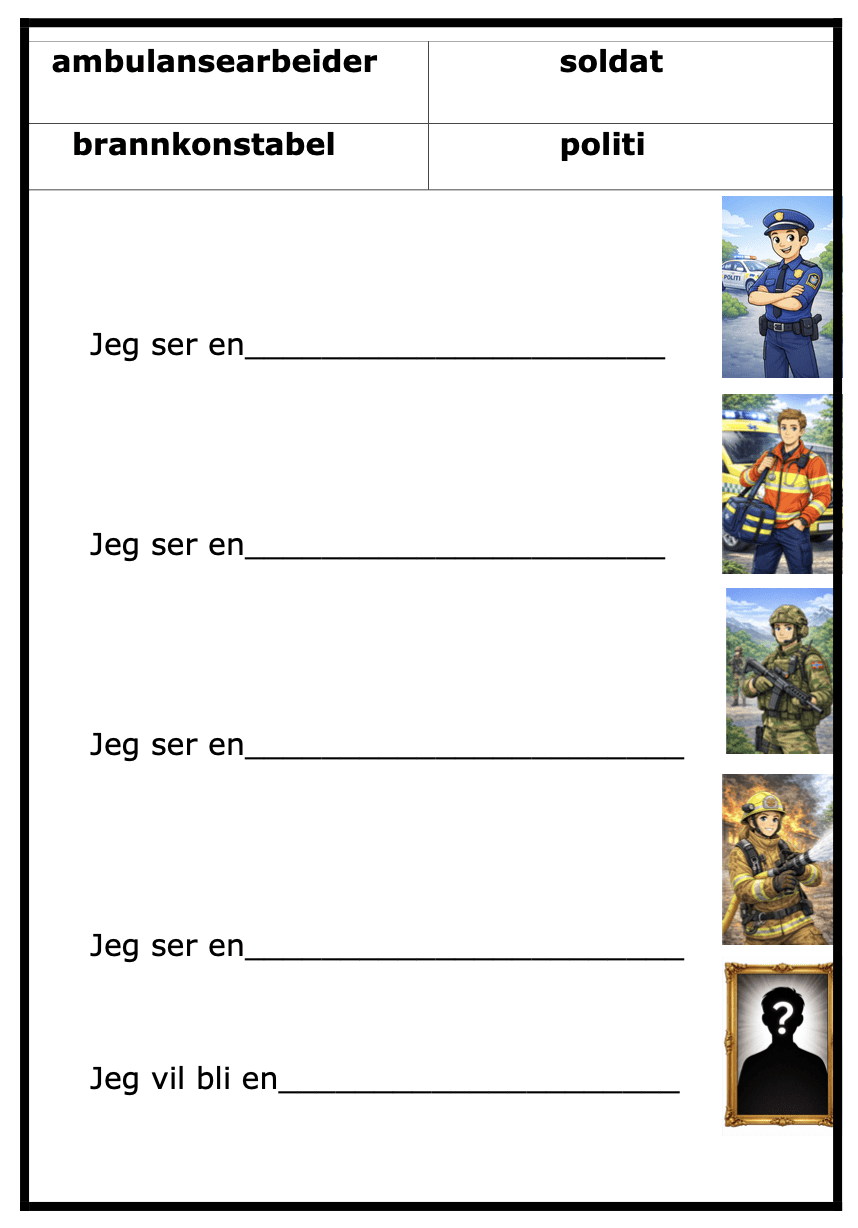 Heftet tar for seg “tøffe” og spennende yrker som politi, brannkonstabel, ambulansearbeider og soldat, noe som kan være motiverende for barn som er interessert i slike yrker. Opplegget gir elevene mulighet til å oppleve mestring samtidig som de trener på å lese lengre ord og setninger.
