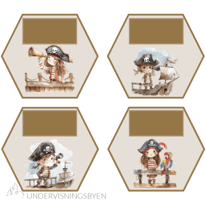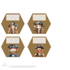 Femkantede lapper med pirattema. Tre ulike typer lapper i atten ulike design.