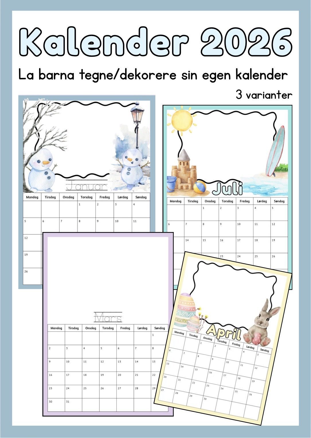 La barna tegne/dekorere sin egen kalender for året 2026. Finnes i ulike varianter.
