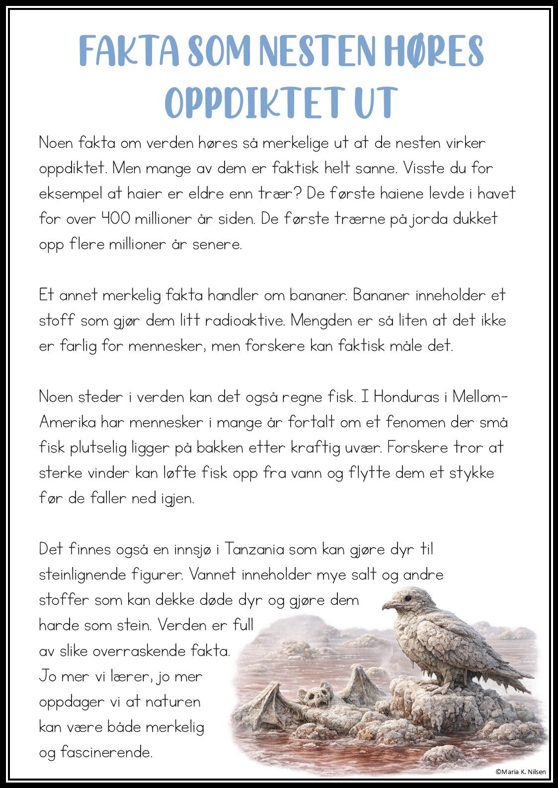 Opplegget inneholder spennende saktekster om verdens rareste fakta – fra dyr med superkrefter til mystiske steder og utrolige fenomener i verdensrommet. Tekstene er tilpasset mellomtrinnet og har en lengde på ca. 200–250 ord for god lesetrening.