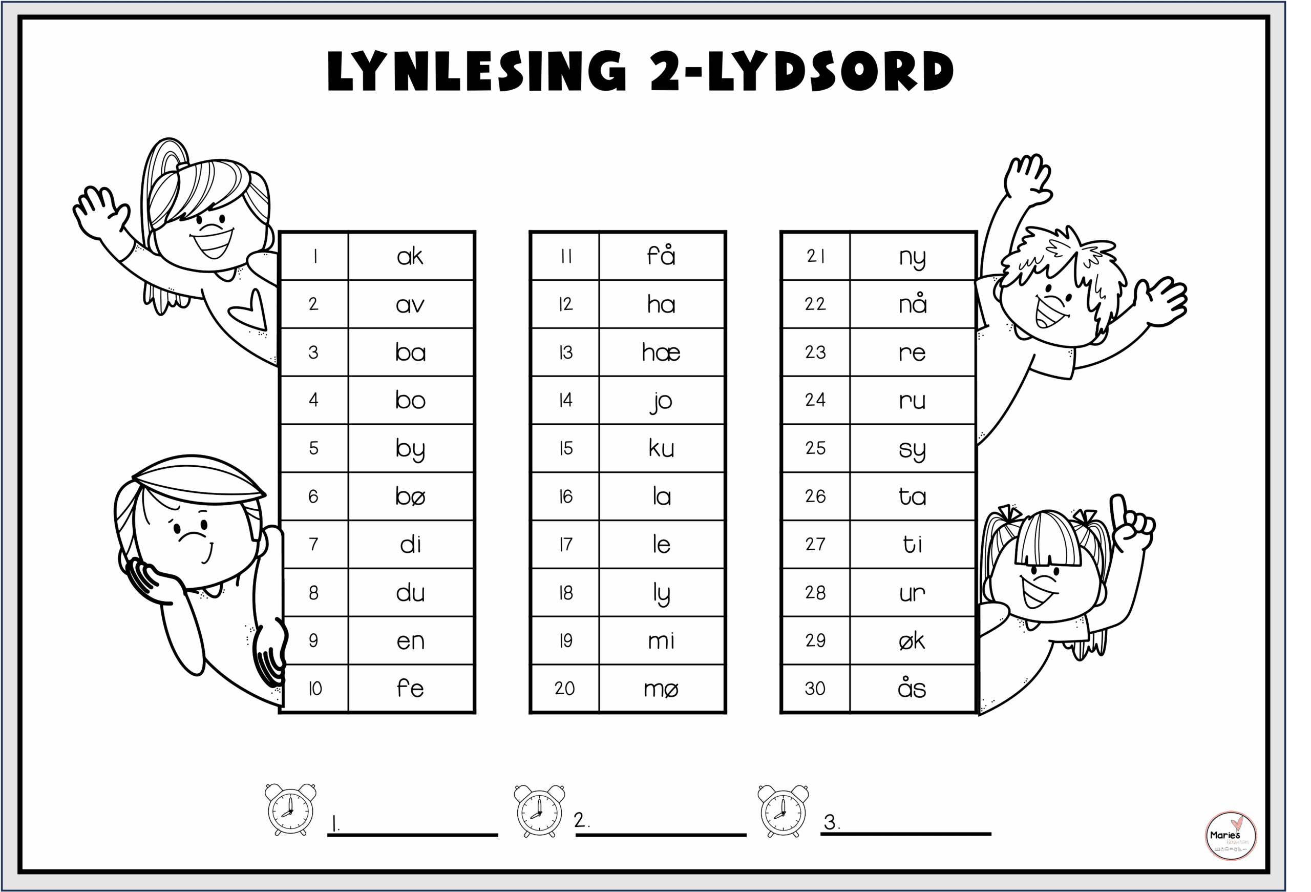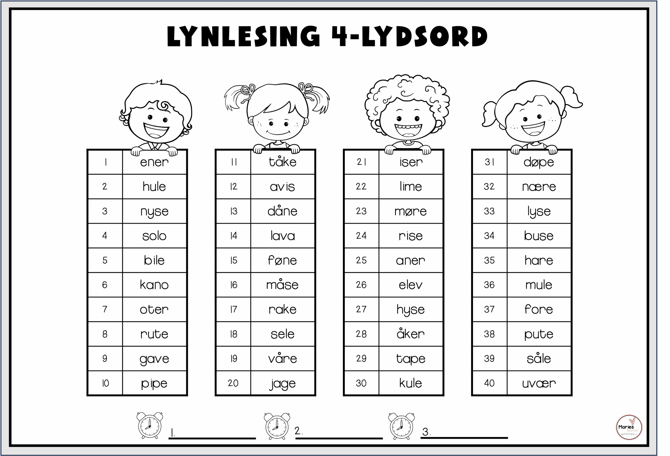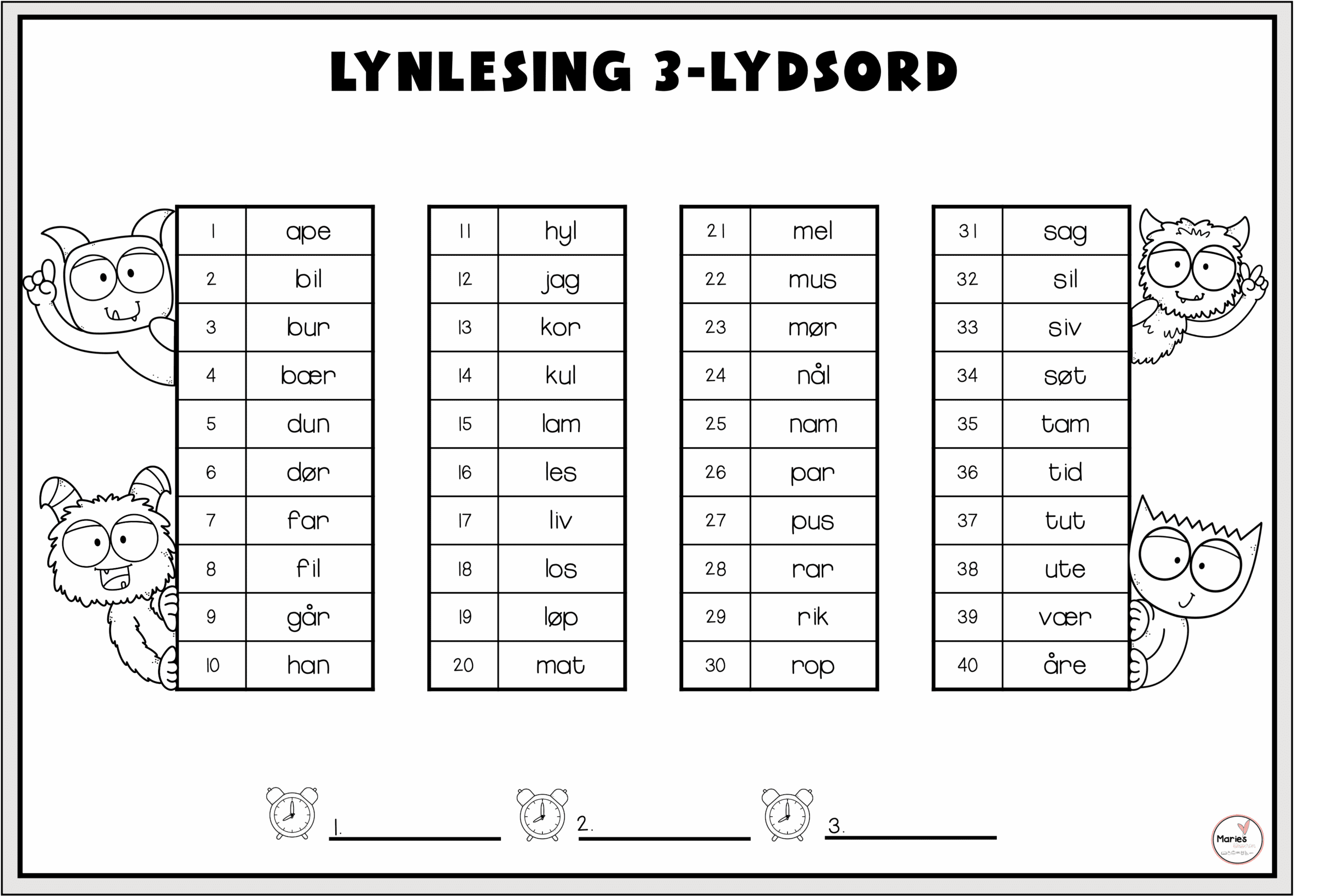 Tanken bak dette er at ordene i alfabetisk rekkefølge gir litt ekstra støtte, da ord som begynner med samme lyd, står sammen. På slutten finner du også to ark med NONSENS-ord.