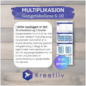 Dette opplegget inneholder 24 sider med fargerik multiplikasjonsøving. Forside er inkludert slik at du kan lage et eget hefte til elevene. Hver av gangetabellene fra 6 til 10 har fått tre sider dedikert til grundig øving. Hovedmålet med heftet er å styrke elevenes mestring gjennom mengdetrening. I tillegg er det laget 8 sider med repetisjon og oppgaver for gangetabellene fra 1 til 10. Dette matteheftet vil også bidra til å automatisere gangetabellene for elevene.