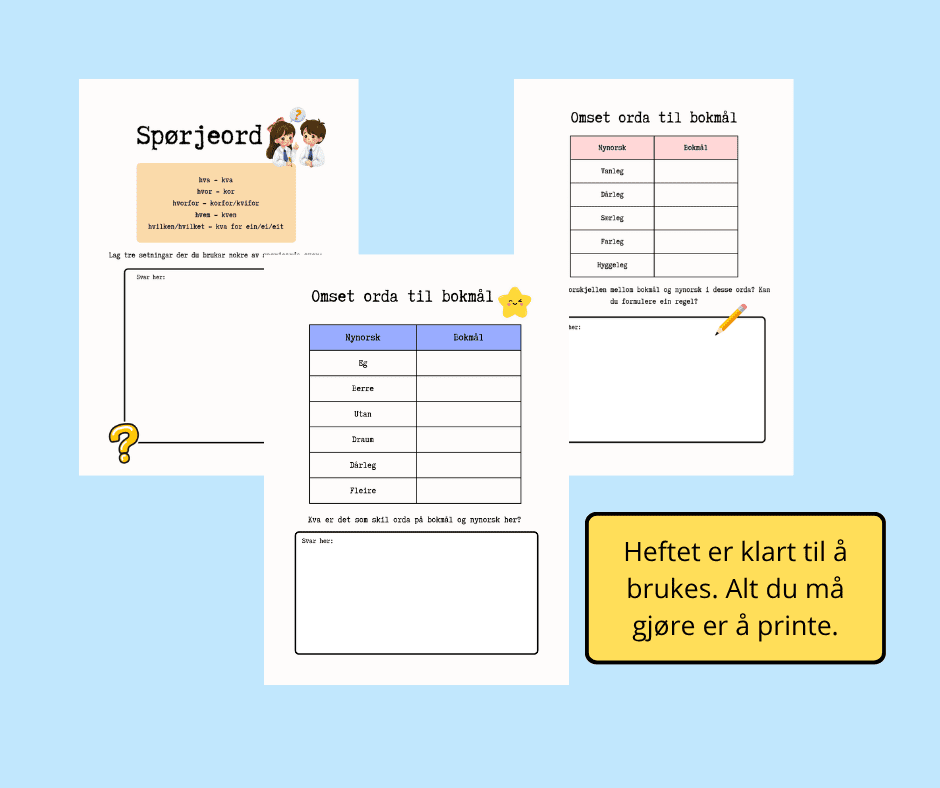 Se bildene for å se hvilke oppgaver som er i heftet. Det er laget for at elevene skal skrive i heftet med blyant. Alt du må gjøre er å printe ut heftet, så er det klart.