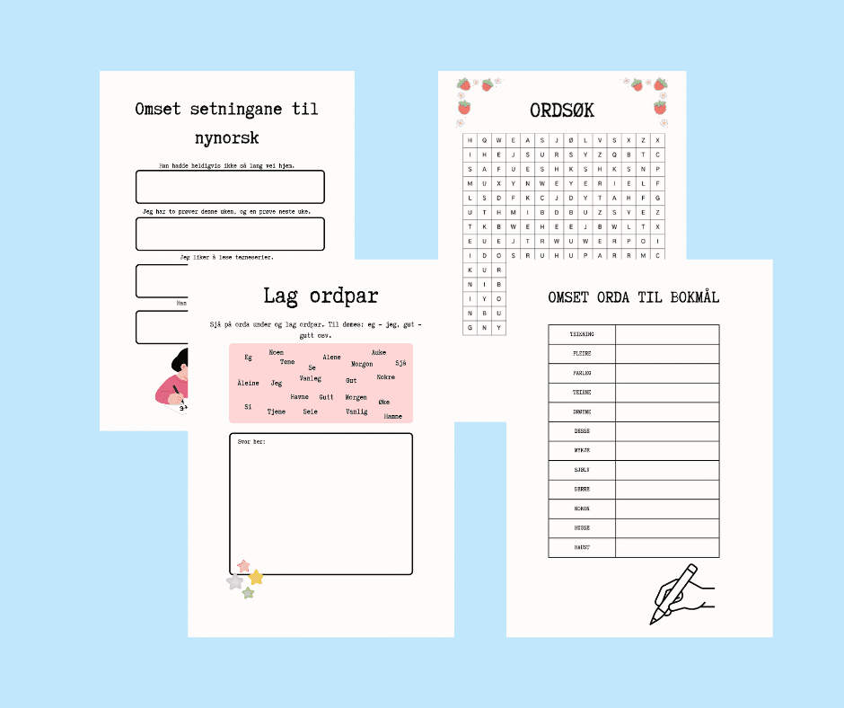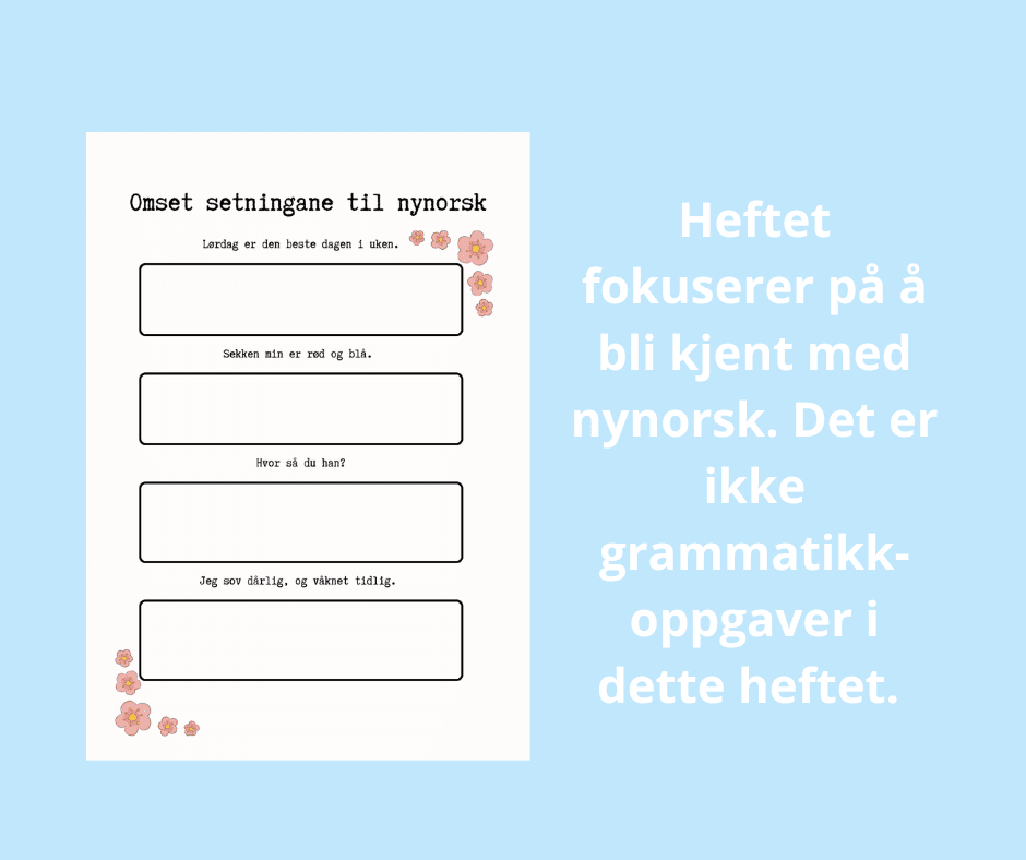 Dette er et hefte med 8 sider med oppgaver for elever som lærer nynorsk som sidemål. Det passer for mellomtrinnet og 8.trinn. Heftet er laget for elever som blir kjent med nynorsk.