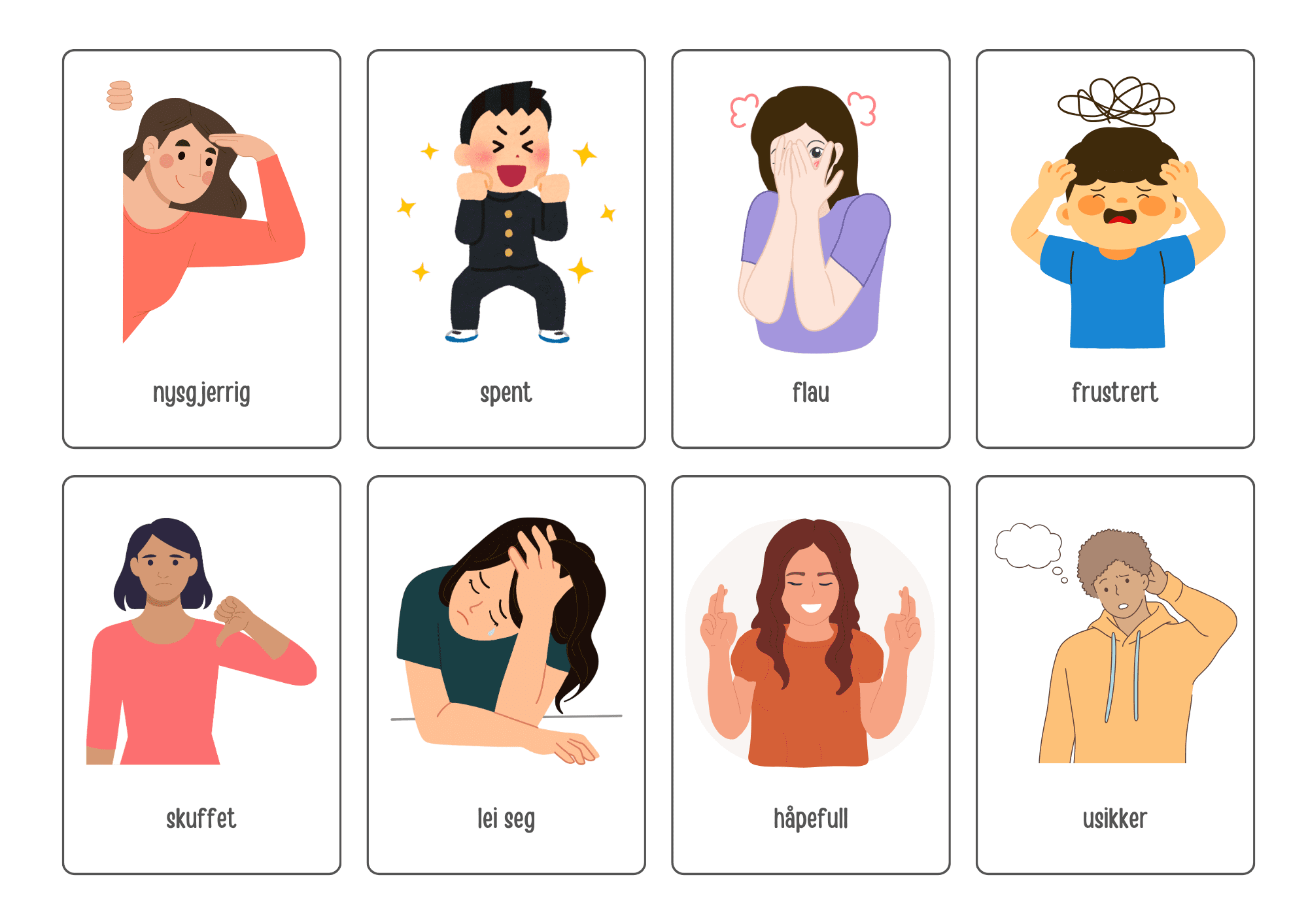 Ordkort om følelser. De kan brukes på mange ulike måter, som for eksempel: