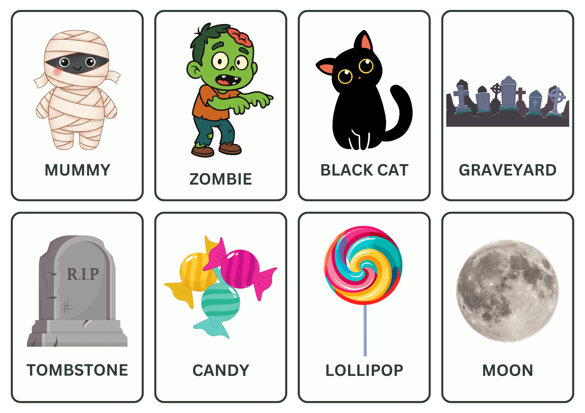 Ordkort om Halloween på engelsk. Se bildene for å se hvilke ordkort som er inkludert.
