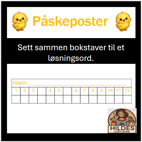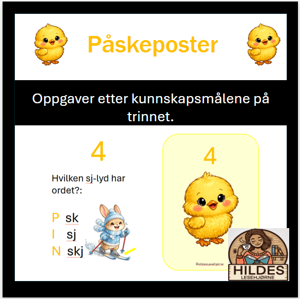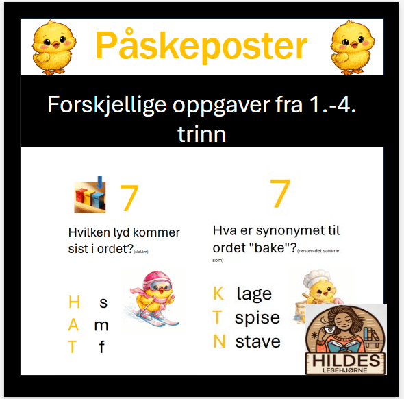 Disse påskeoppgavene kan dere bruke på tur, i skolegården eller i gangen. De kommer på 4 nivårer som passer til 1. – 4. trinn. Det er 12 forskjellige oppgaver til hvert trinn. Oppgavene er laget etter målene for de forskjellige trinnene i norskfaget. Elevene skal ta med seg en bokstav fra hver post og til sammen skal de danne et løsningsord.