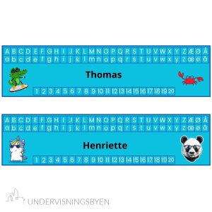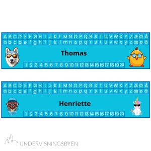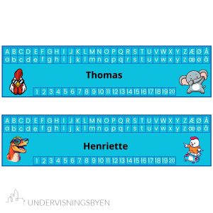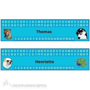 Undervisningsmateriell: her får du 30 navnelapper med alfabetet i store og små bokstaver og tallene fra 1 til 20. Hver navnelapp har ulike kule dyremotiver, slik at de fleste eleven kan få sine egne motiver med sitt navn på. Du får tilsendt dokumentet i en wordfil slik at du kan skrive inn elevens navn og printe ut. Navnelappene er bilder i wordfilen med tekstboks for å redigere navnene.