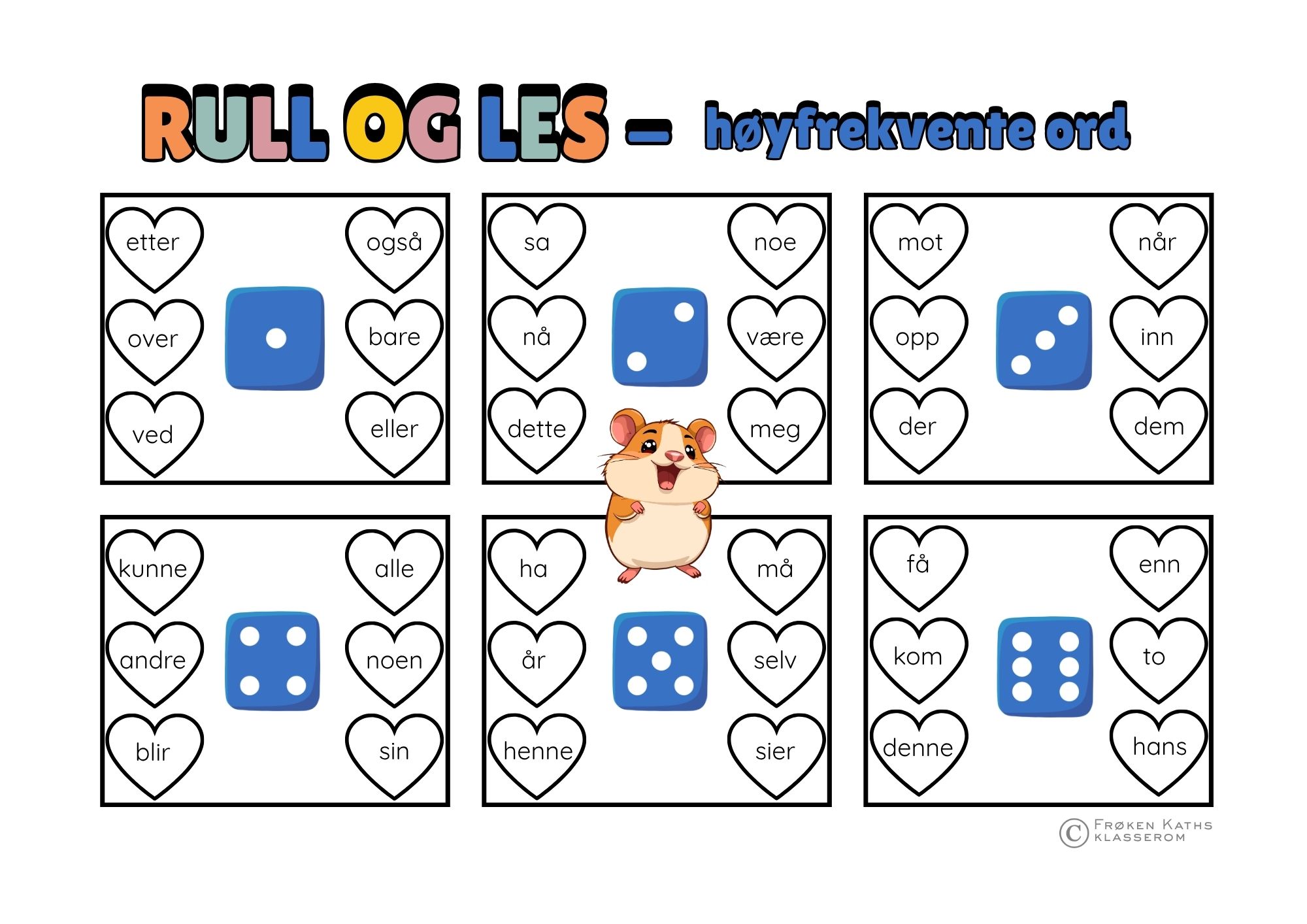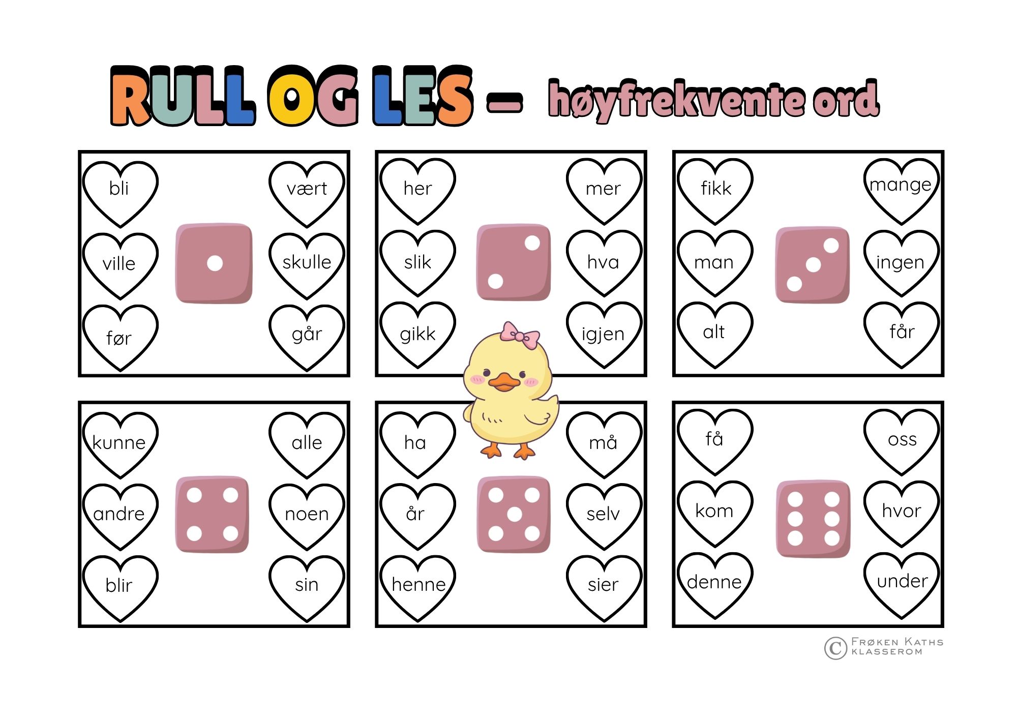 Rull og les: høyfrekvente ord leseark