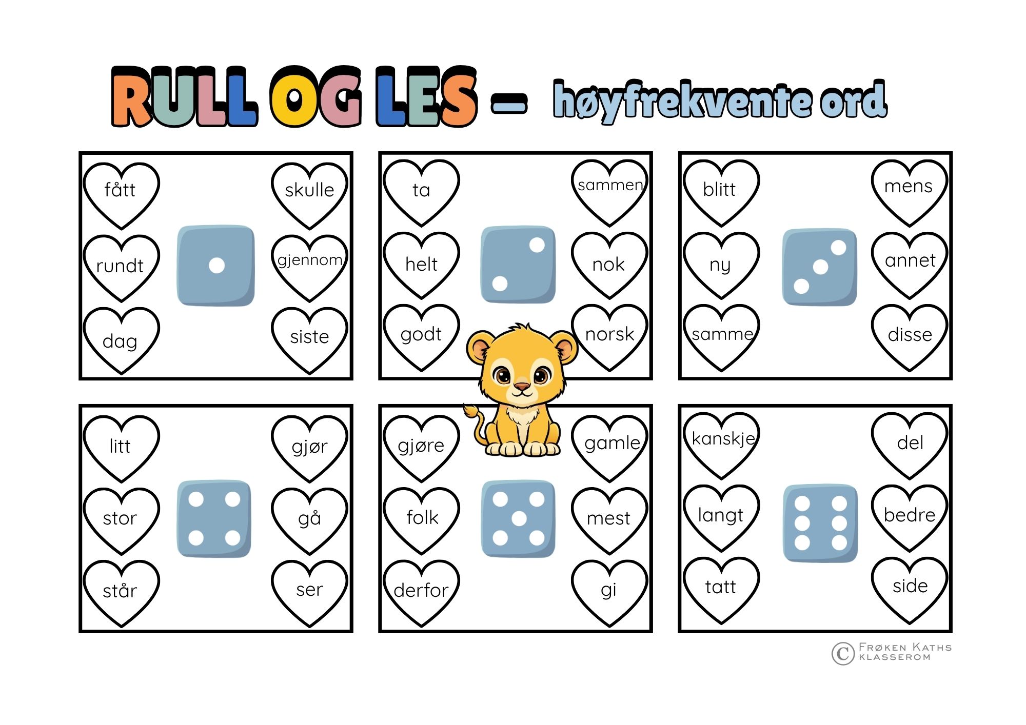 Elevene kaster en terning og finner boksen med det tilsvarende antallet prikker. De velger et ord fra boksen leser det høyt (eller skriver det ned), og markerer ordet som fullført. Ved å laminere arkene kan de brukes igjen og igjen med whiteboard-tusj, eller dere kan bruke små brikker og figurer for å gjøre det enda mer visuelt.