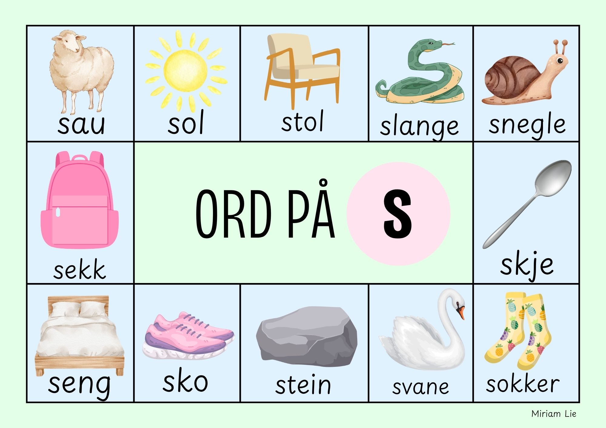 Hvert ark har én bokstav, ca. 12 ord med bildestøtte. Kan brukes i A4 til individuelt arbeid eller A3 som plakat i klasserommet. Ordene har ulik vanskelighetsgrad.