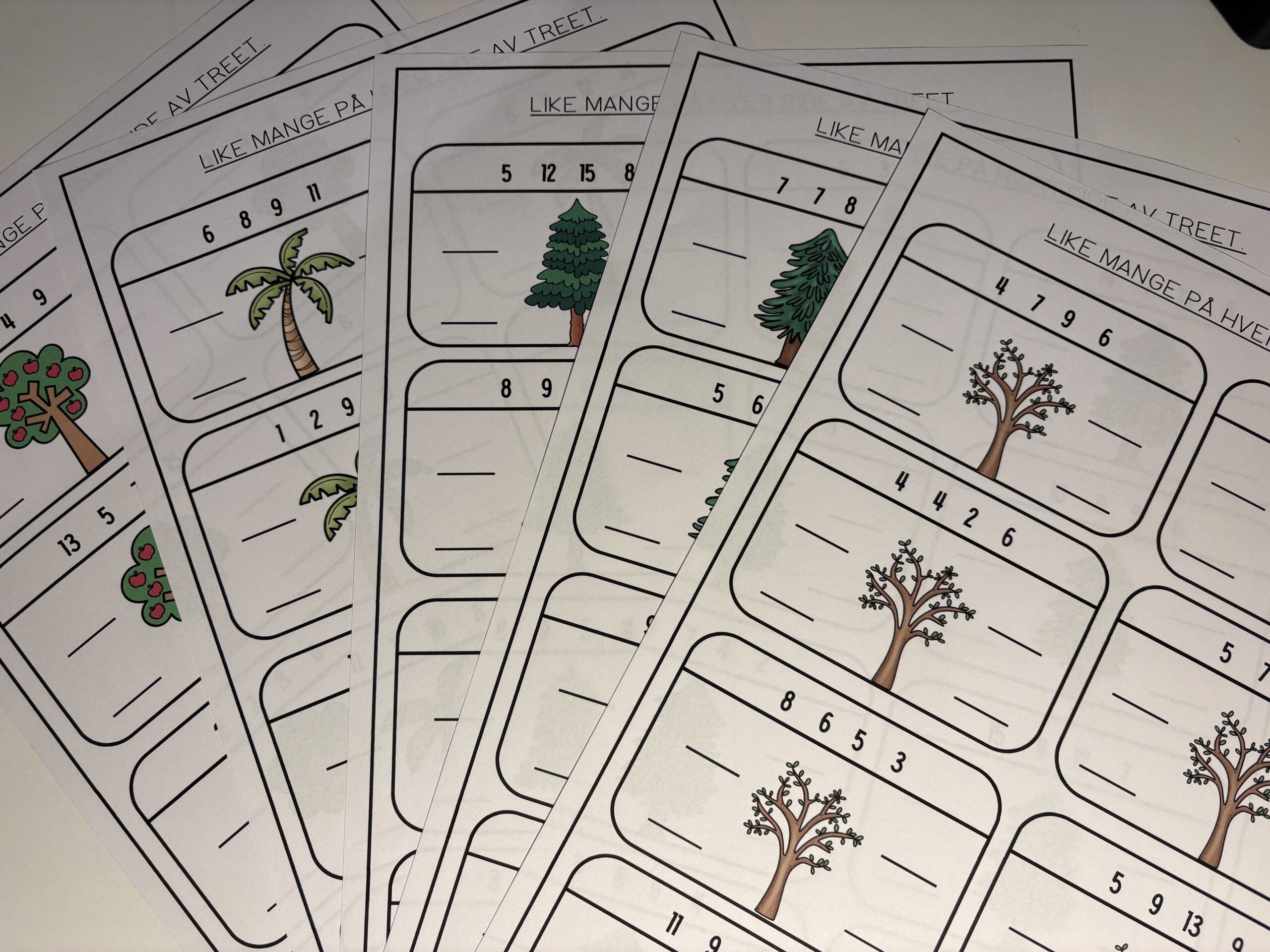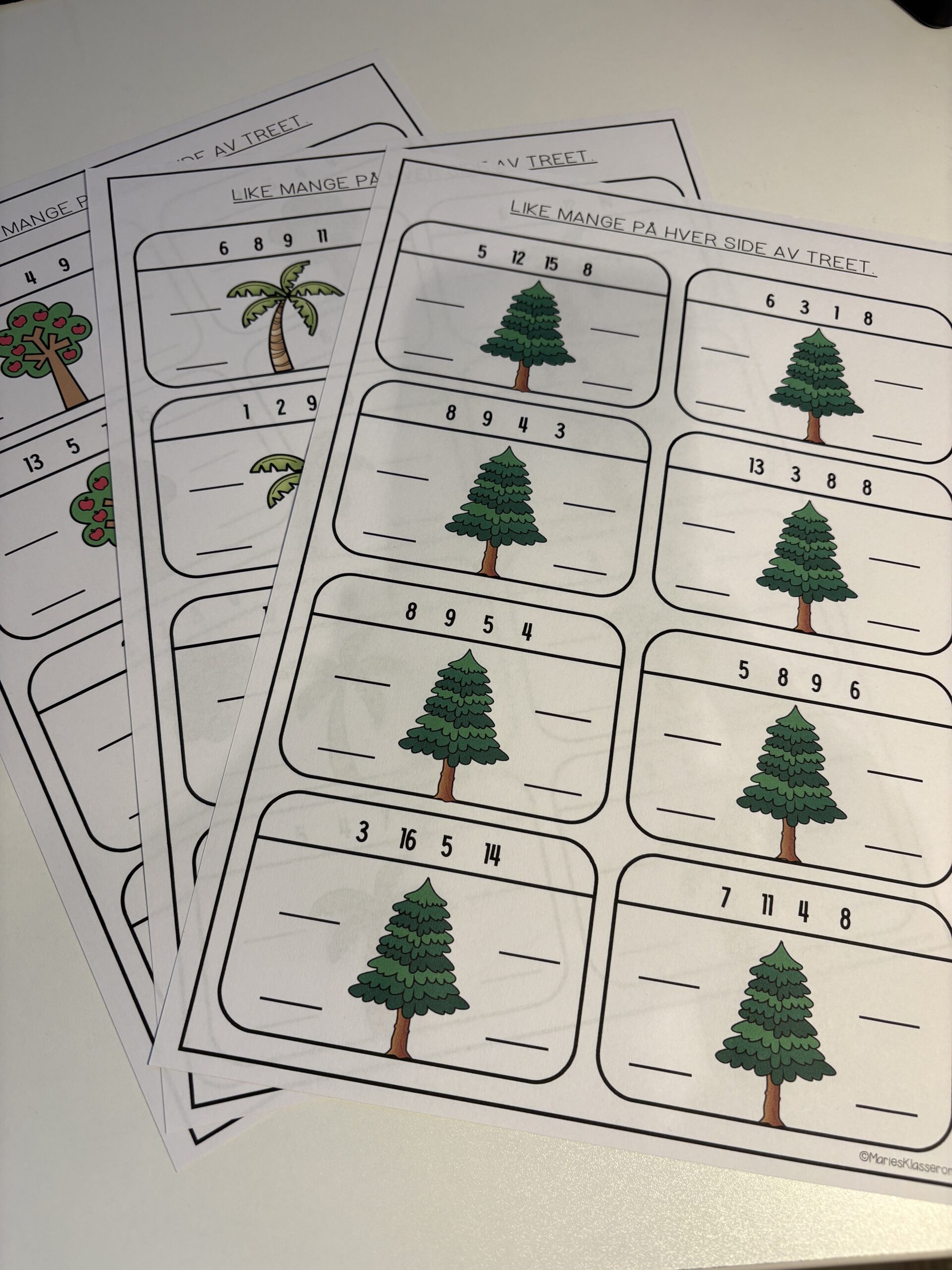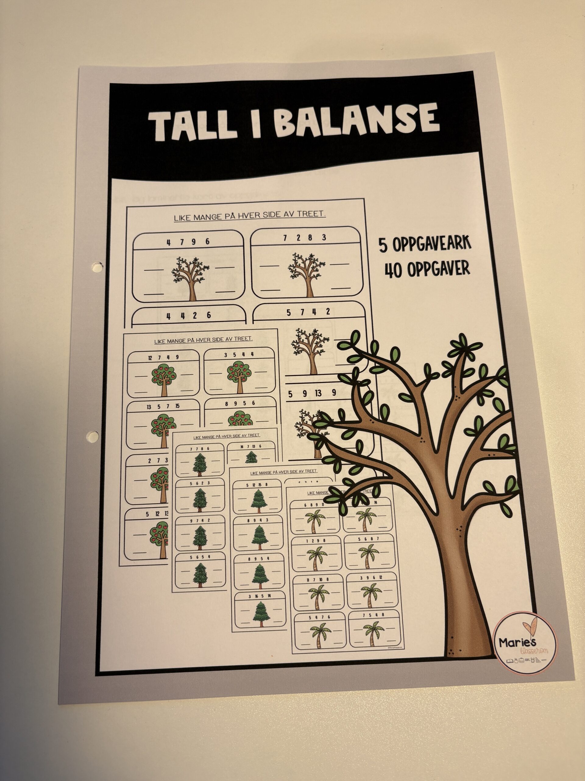 TALL I BALANSE er 5 oppgaveark hvor elevene øver på å sette sammen to og to tall med addisjon, så det blir balanse på begge sidene.