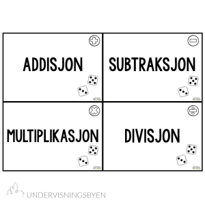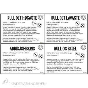 Dette er ei samling med terningspel eg har samla opp gjennom som øver på dei fire rekneartane. Fila kjem til å bli oppdatert etterkvart som eg kjem borti og lærer meg nye spel. Send meg gjerne ei melding om du kan eit spel som ikkje er med her 🙂 Sjå på oversikta over spel i bileta her – det er færrast spel til divisjon.