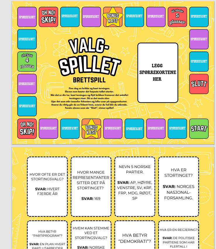 Et brettspill utformet for ungdomsskoleelever som trenger å repetere og øve på begreper knyttet til stortingsvalget. Skrives ut, lamineres og brukes! 1 brett + 32 spørrekort.